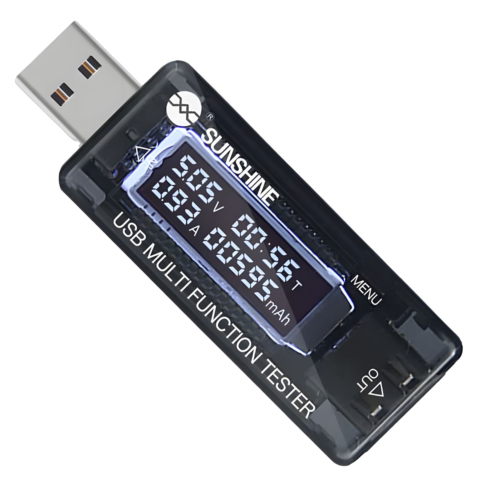 Компактный многофункциональный USB тестер Sunshine SS-302A предназначен для оперативного и точного контроля параметров зарядки мобильных устройств. Устройство пригодится в мастерской, в магазине мобильной техники и для домашнего использования — при проверке зарядніх устройств, кабелей, повербанков и реальной ёмкости аккумуляторов.