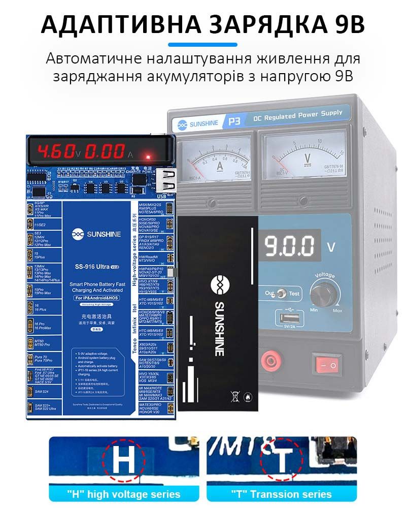 Sunshine SS-916 Ultra — этосовременныйтестер-активатораккумуляторов, предназначенныйдлязарядки, активации и диагностикилитий-ионныхаккумуляторов смартфонов. Устройствоподдерживаетболее 500 моделей, включая iPhone (6–16 ProMax) и большинство популярных Android-устройств (Samsung, Huawei, Xiaomi, Oppo, Vivo, Infinix, Tecno).