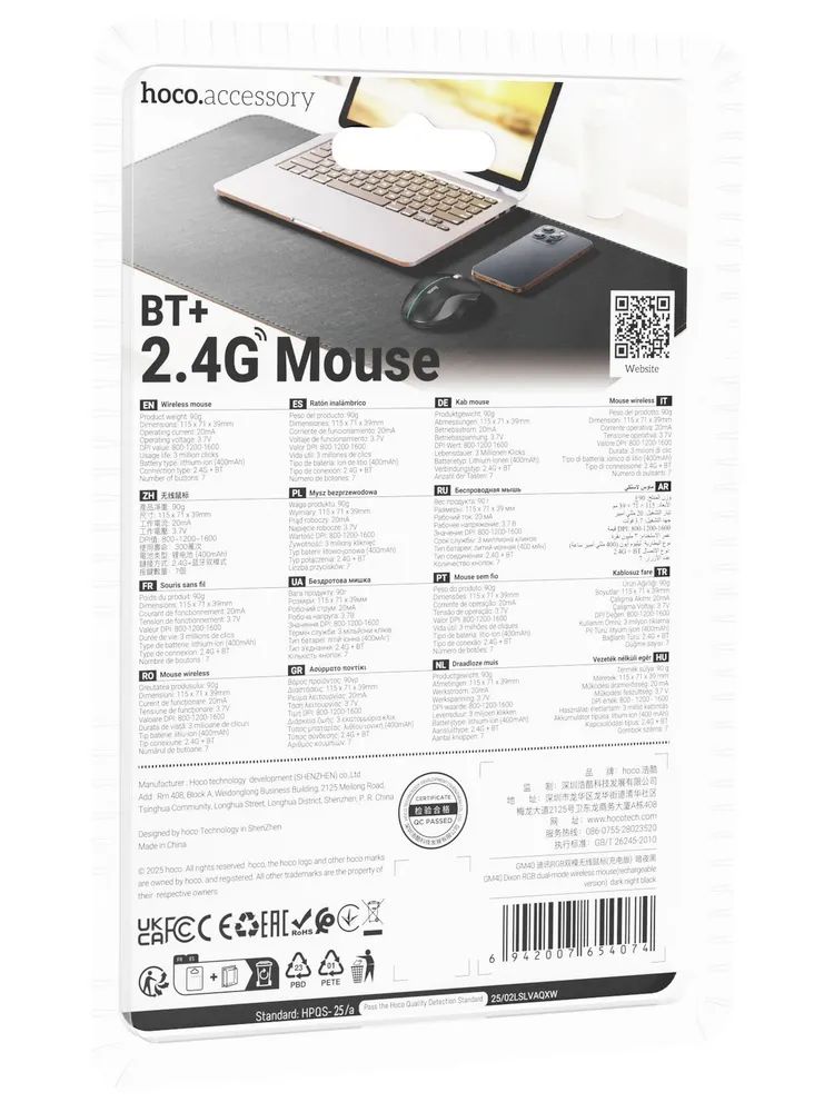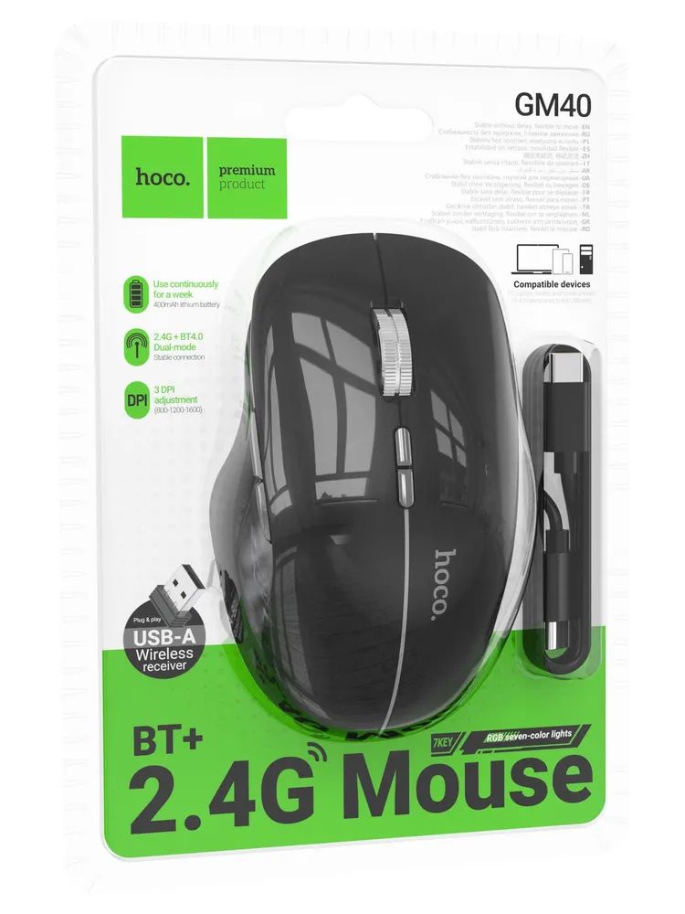 HOCO GM40 – это стильная и функциональная беспроводная мышка с яркой RGB-подсветкой, двойным режимом подключения и высокой точностью сенсора. Она идеально подходит для работы в офисе, обучении или гейминге, обеспечивая комфорт и надежность в ежедневном использовании.