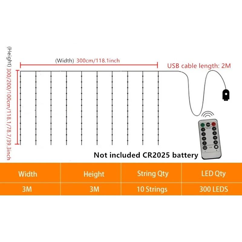 LED гирлянда-штора 3x3 м (холодный белый/USB/Пульт/8 режимов) без крючков