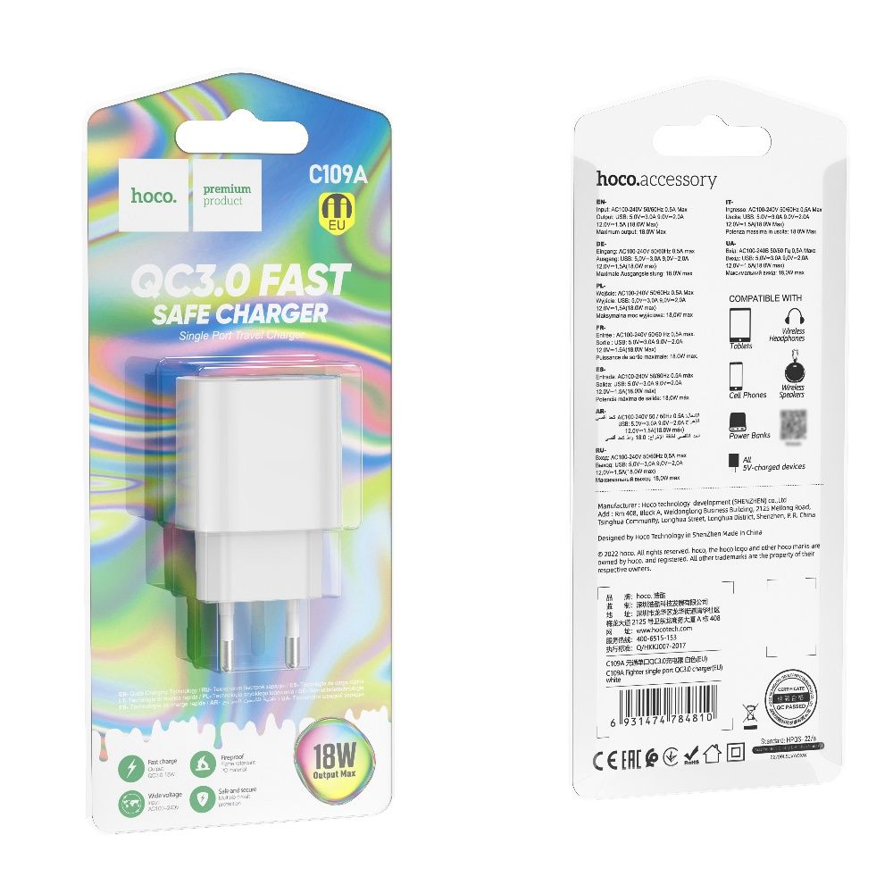 Сетевое зарядное устройство Hoco C109A USB QC 18W, белое