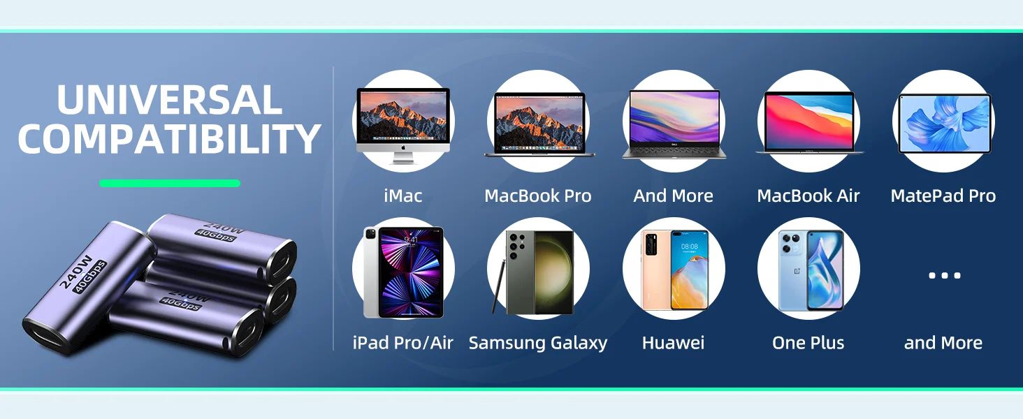 Переходник Type-C Female to Female — этоуниверсальный и высокотехнологичныйконнектор, созданныйдлясоединениякабелей и устройств с разъёмом Type-C. Онобеспечиваетсверхбыструюпередачуданных, качественнуютрансляциювидео в формате 8K, а такжеподдержкубыстройзарядкимощностьюдо 240 Вт.