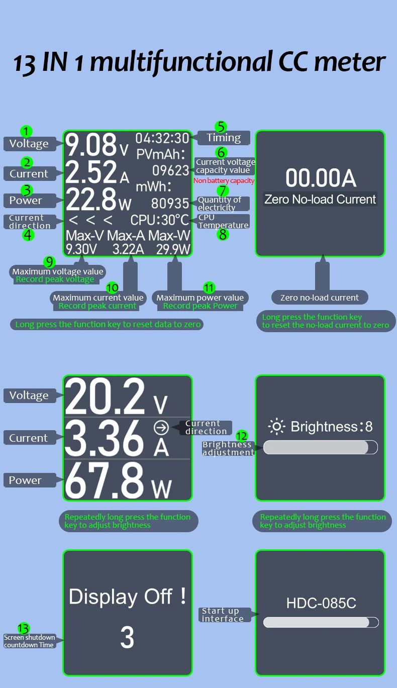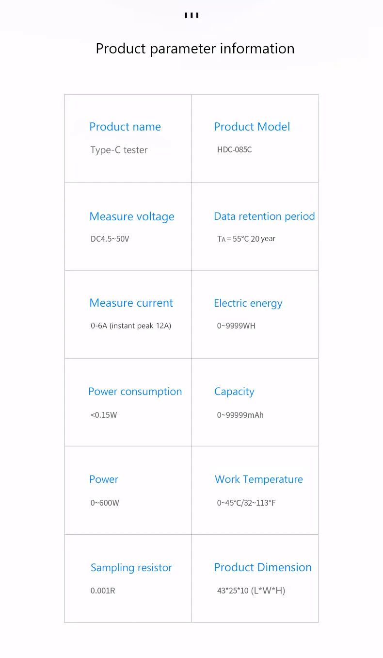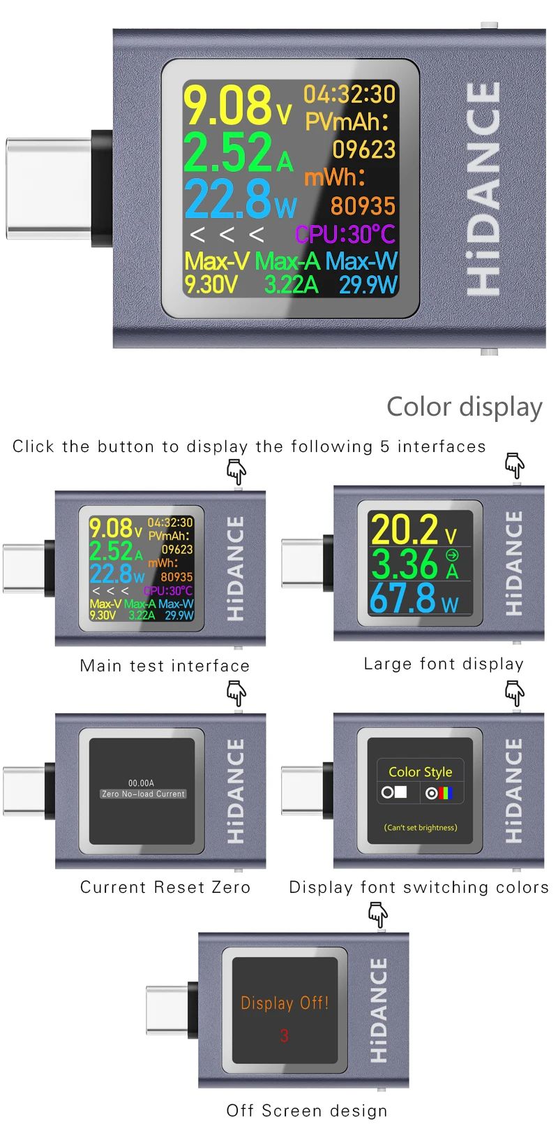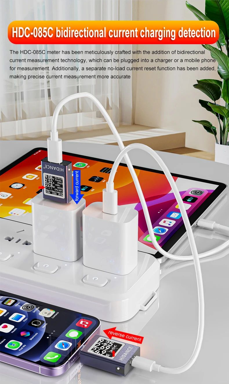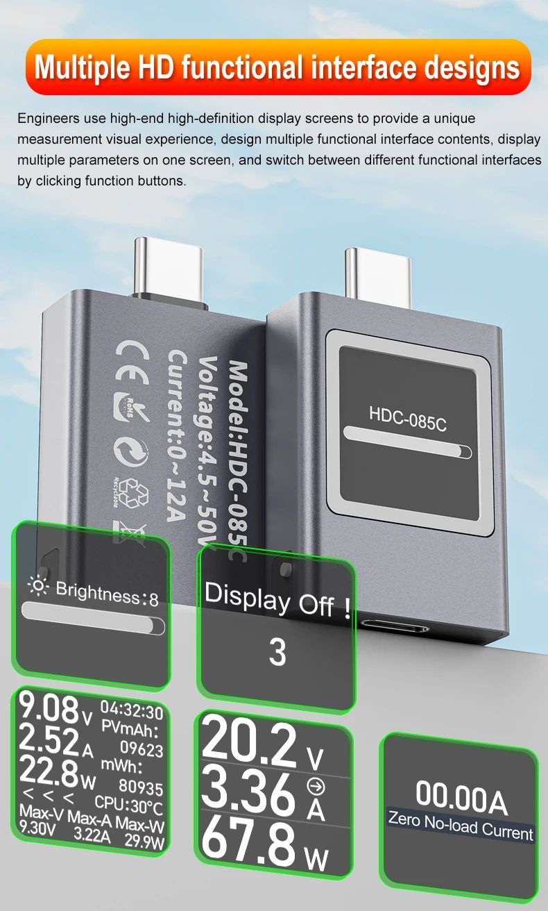 Тестер HDC-085C — этосовременноемногофункциональноеустройстводляизмеренияпараметровзарядки и потребленияэлектроэнергии. Онпозволяет в режимереальноговремениконтролироватьнапряжение, силутока, мощность, энергию, ёмкость и температуру, а такжеподдерживаеттестированиебольшинствапротоколовбыстройзарядки. Благодарякомпактнымразмерам, металлическомукорпусу и яркому OLED-дисплеюприборстанетудобныминструментомкакдляспециалистов, так и дляобычныхпользователей.