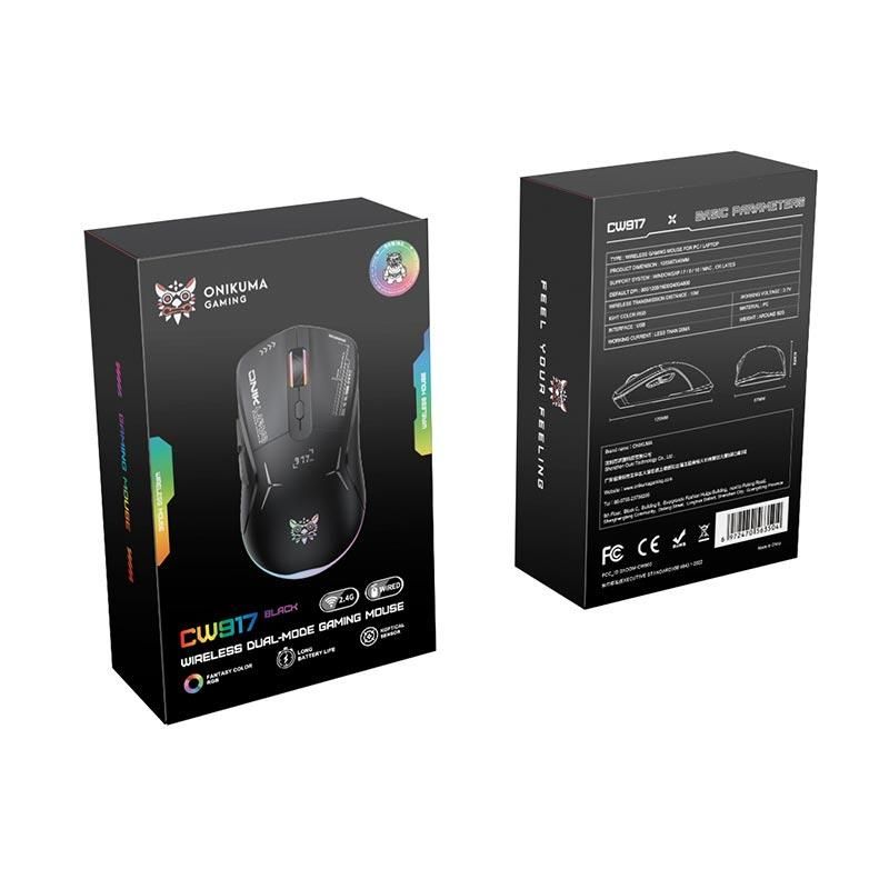 Onikuma CW917 — этоуниверсальнаяигроваямышь, сочетающаяпроводное и беспроводноеподключение, высокоточныйсенсор и стильную RGB-подсветку. Онасозданадлягеймеров, которыеценятсвободу, комфорт и надёжностькакдома, так и натурнирах.