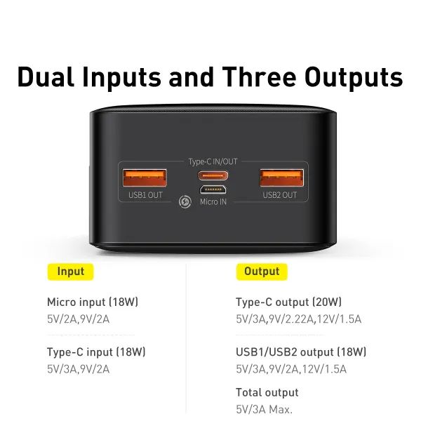 - Type-C (PD 3.0): 5V/3A, 9V/2.22A, 12V/1.5A (20W)