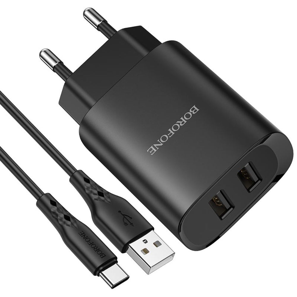 Черное сетевое зарядное устройство Borofone BN2 с 2 USB + кабель USB to Type-C
