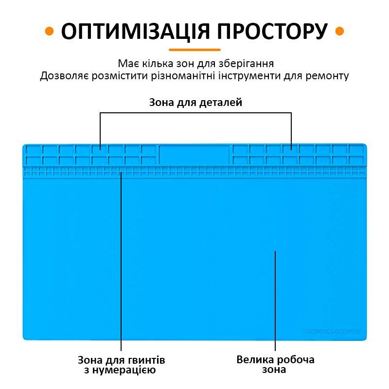 - Поверхность коврика оснащена встроенными секциями, ячейками и углублениями, которые позволяют аккуратно размещать инструменты, винты, микросхемы и другие мелкие компоненты. Это значительно повышает удобство и эффективность работы, обеспечивая порядок на рабочем месте.