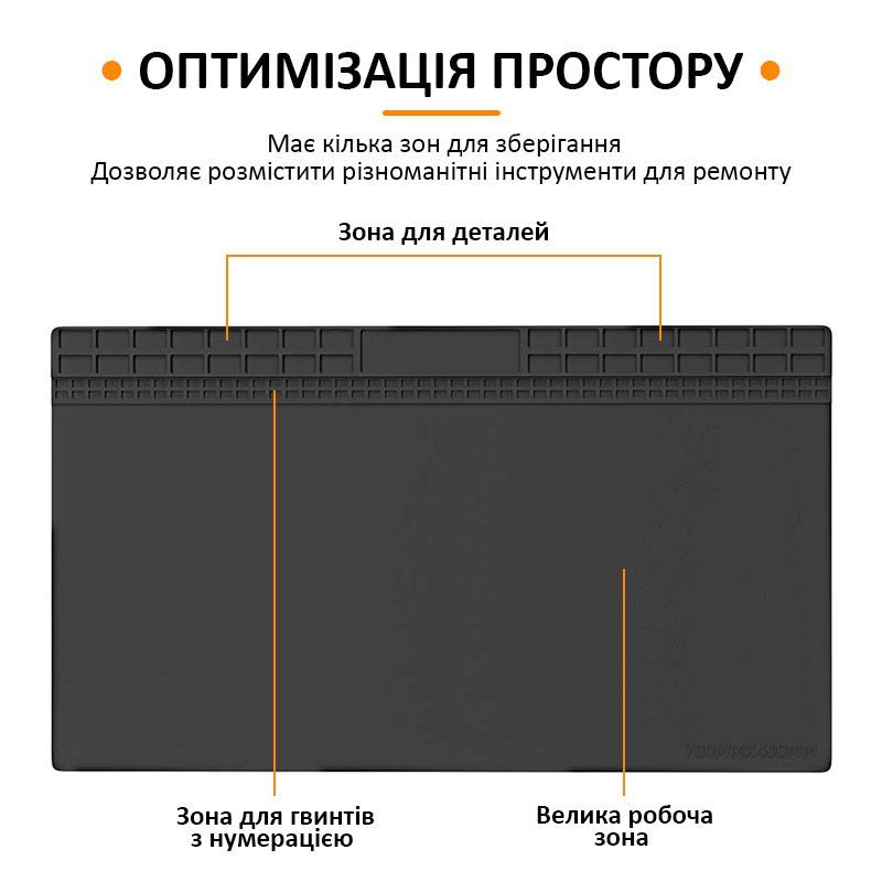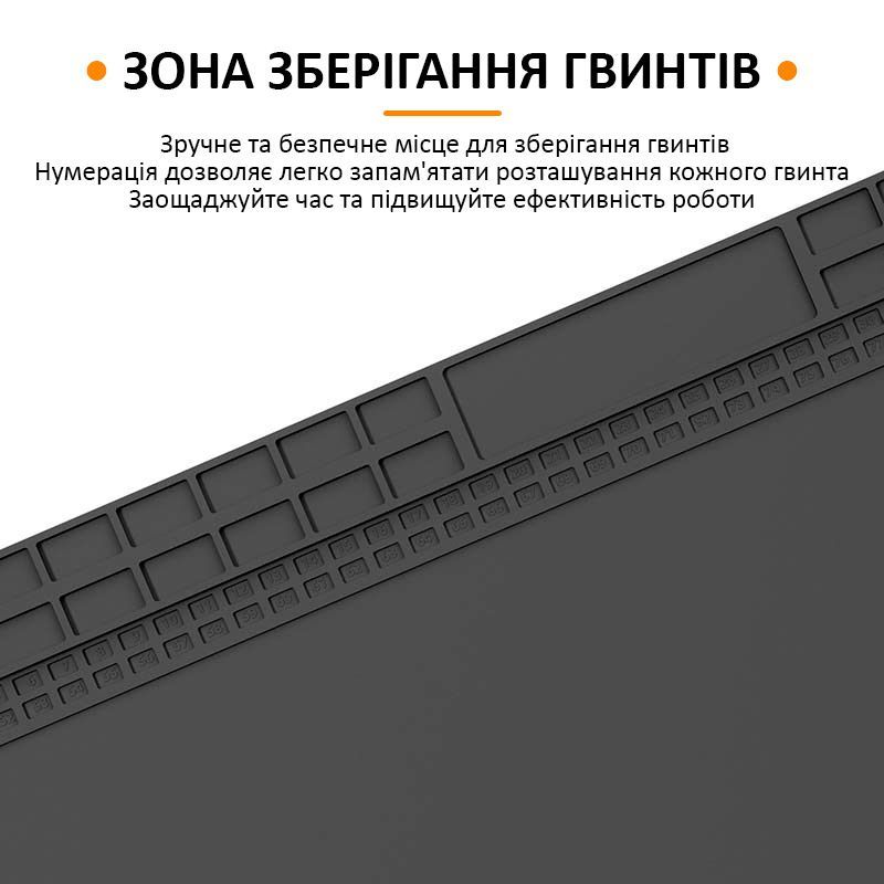 - Поверхность коврика оснащена встроенными секциями, ячейками и углублениями, которые позволяют аккуратно размещать инструменты, винты, микросхемы и другие мелкие компоненты. Это значительно повышает удобство и эффективность работы, обеспечивая порядок на рабочем месте.