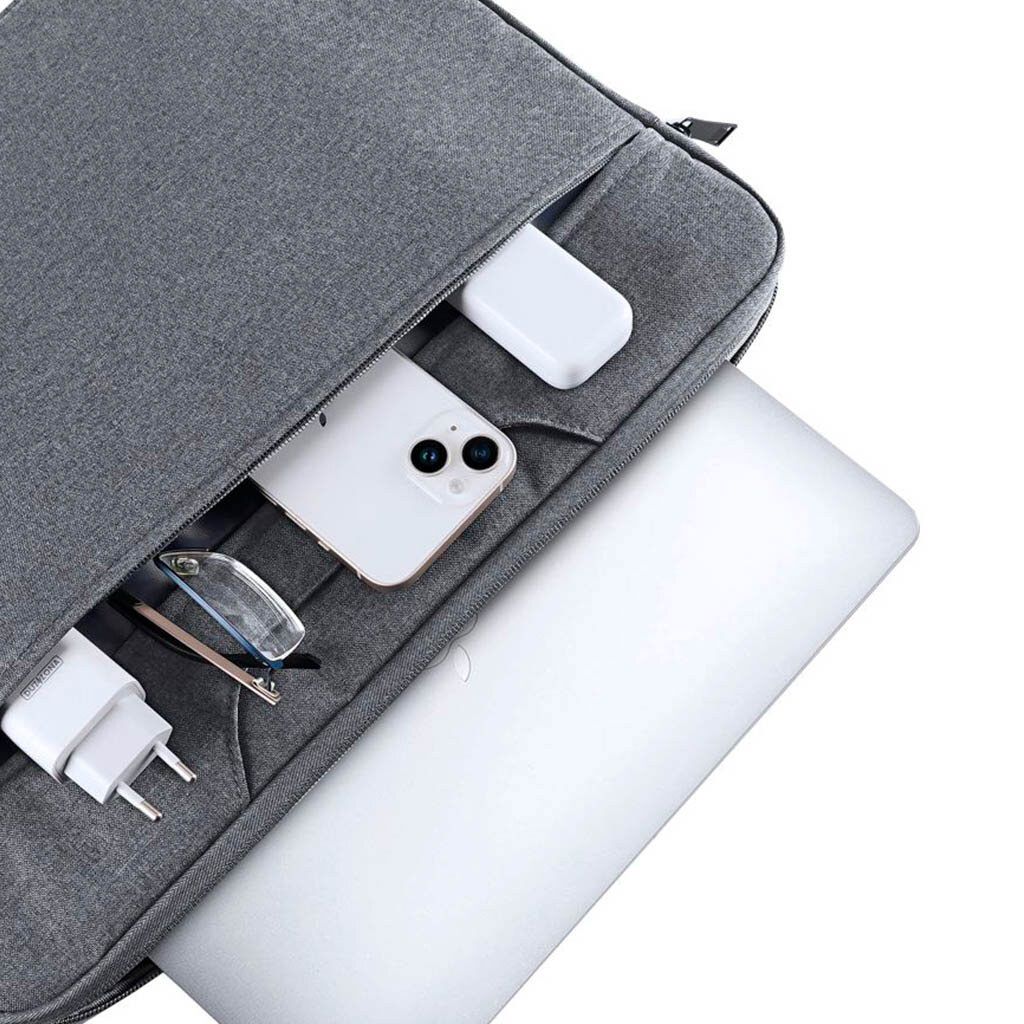 - Горизонтальная конструкция с скруглёнными углами и удобными ручками делает сумку практичной и комфортной при переноске. Толщина корпуса всего 3 см, что позволяет легко помещать её в рюкзак или чемодан, сохраняя при этом достаточную вместительность для ноутбука и аксессуаров.