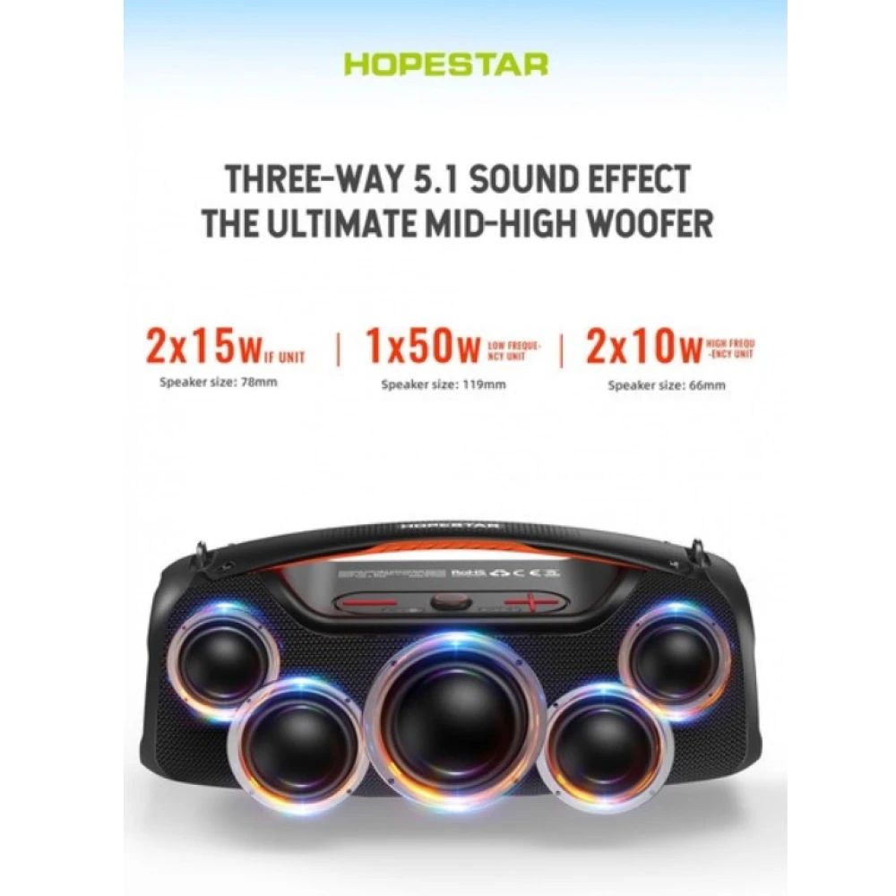 - Hopestar A60 оснащена пятикомпонентной звуковой системой общей мощностью 100 Вт, обеспечивающей чёткое и насыщенное звучание. Даже при максимальной громкости звук остаётся сбалансированным, с глубокими басами и яркими высокими частотами.