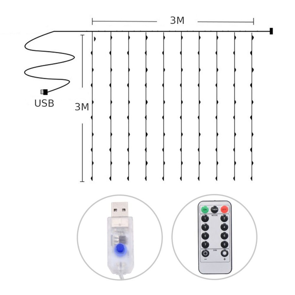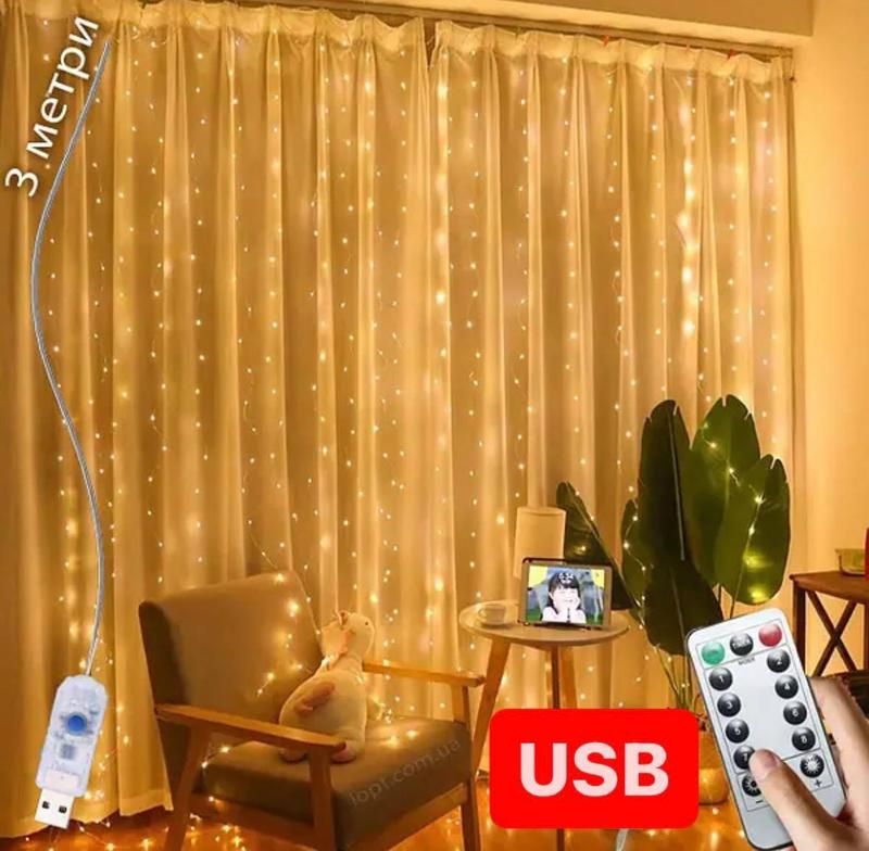 Светодиодная гирлянда USB штора, медная нить, теплый белый, 3x3 м, БЕЗ КРЮЧКОВ, 8 режимов, с пультом