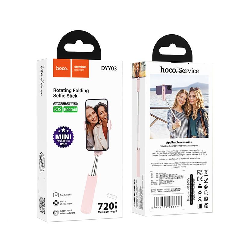 - В сложенном состоянии Hoco DYY03 напоминает компактный аксессуар, который легко носить в кармане джинсов, маленькой сумке или рюкзаке. Такой форм-фактор удобен для ежедневного использования: селфи-стик всегда под рукой и не занимает много места в поездке или на прогулке.