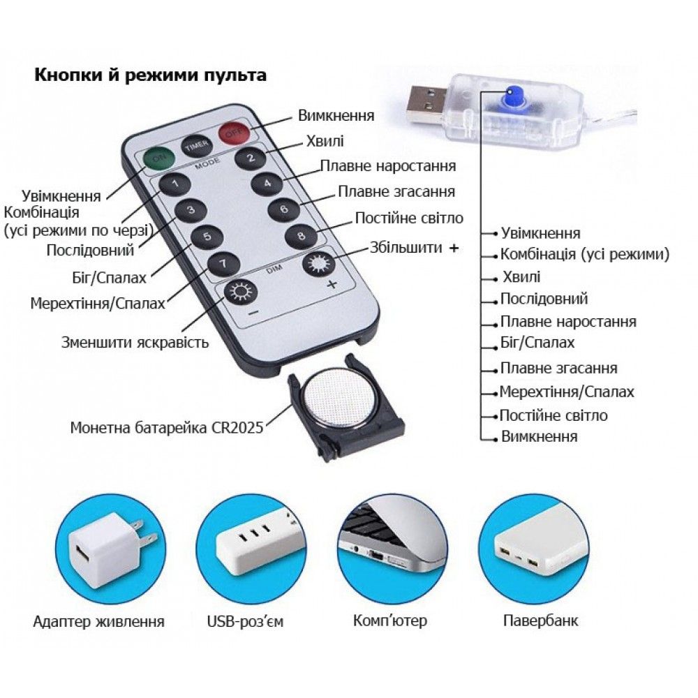 - Пульт позволяет менять эффекты одним нажатием кнопки, плавно уменьшать или увеличивать яркость и включать таймер, чтобы гирлянда сама выключалась ночью и включалась вечером, экономя энергию и продлевая срок службы.