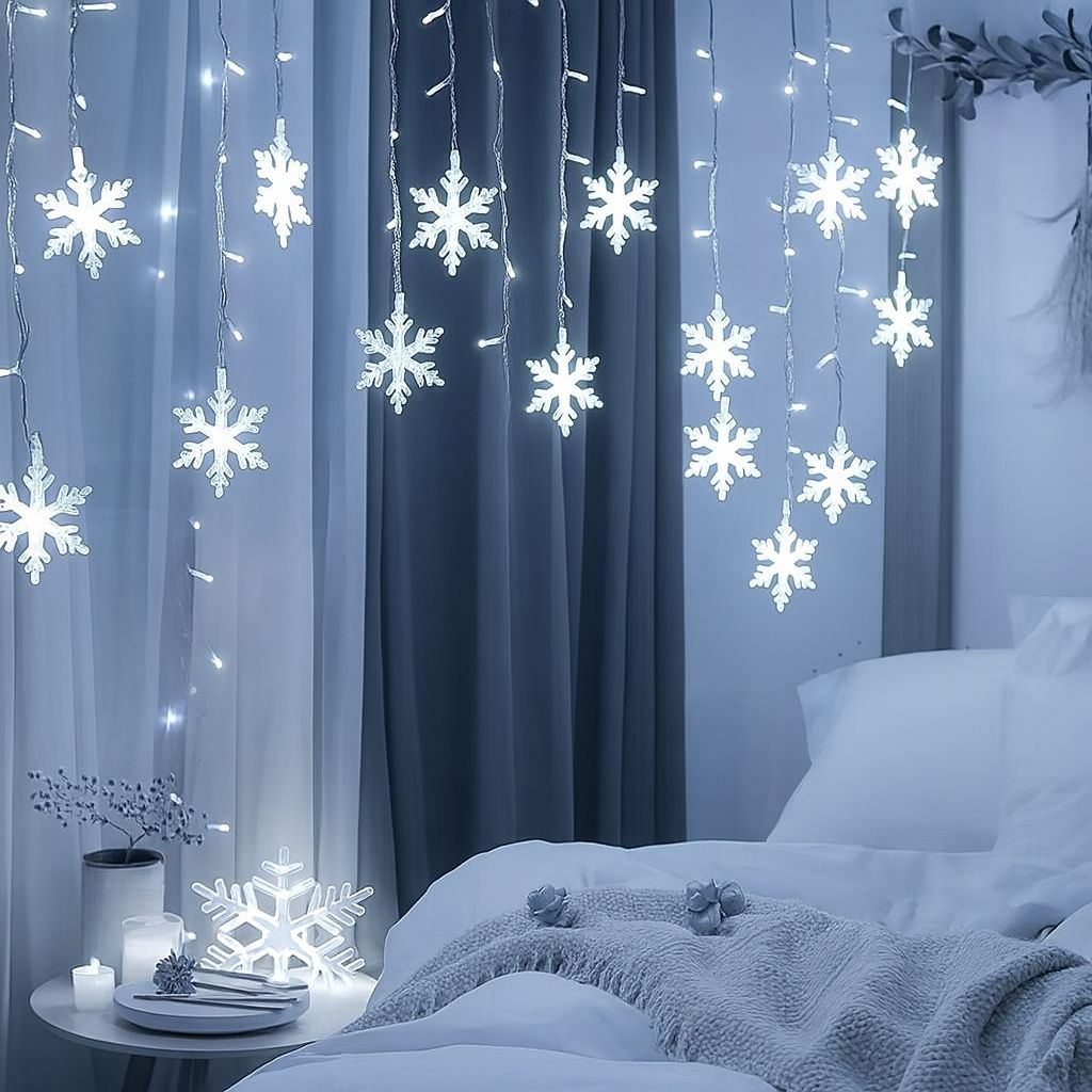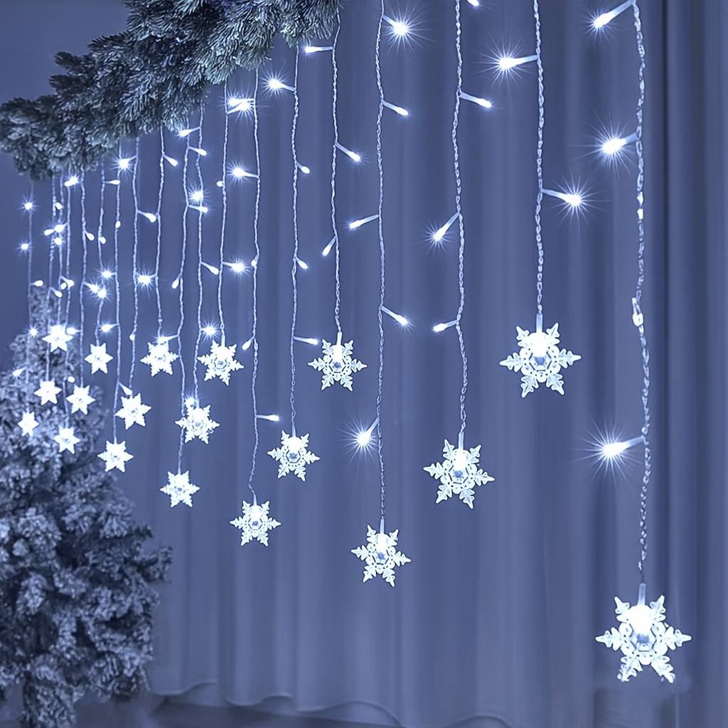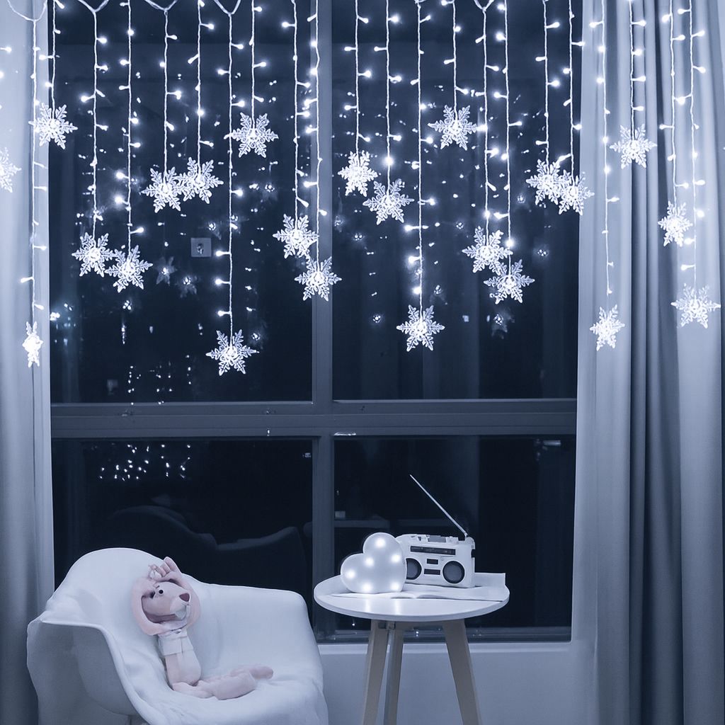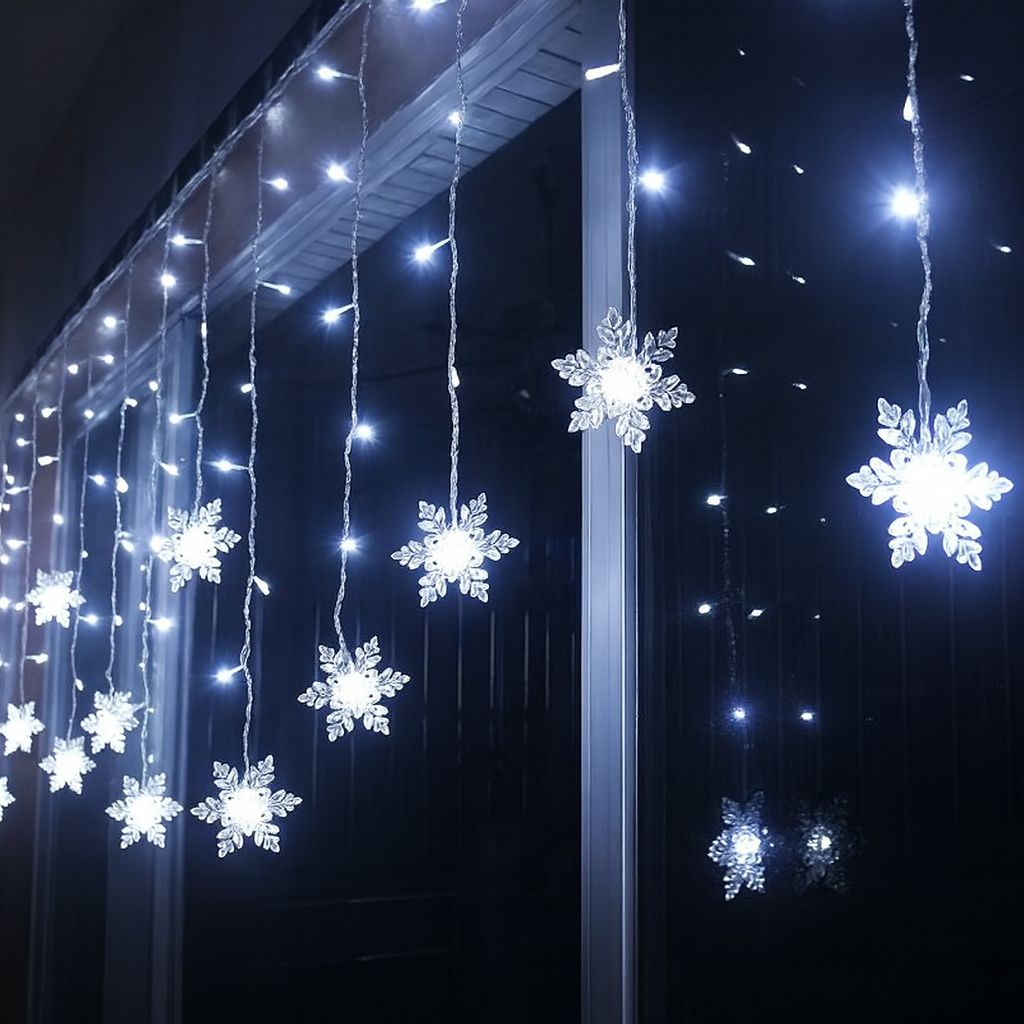 Эта светодиодная гирлянда-штора с фигурками снежинок и длиной 4×0,7 м, работающая от сети 220 V создаёт яркое свечение и идеально подходит для оформления окон, стен, витрин и новогоднего декора в доме или офисе.