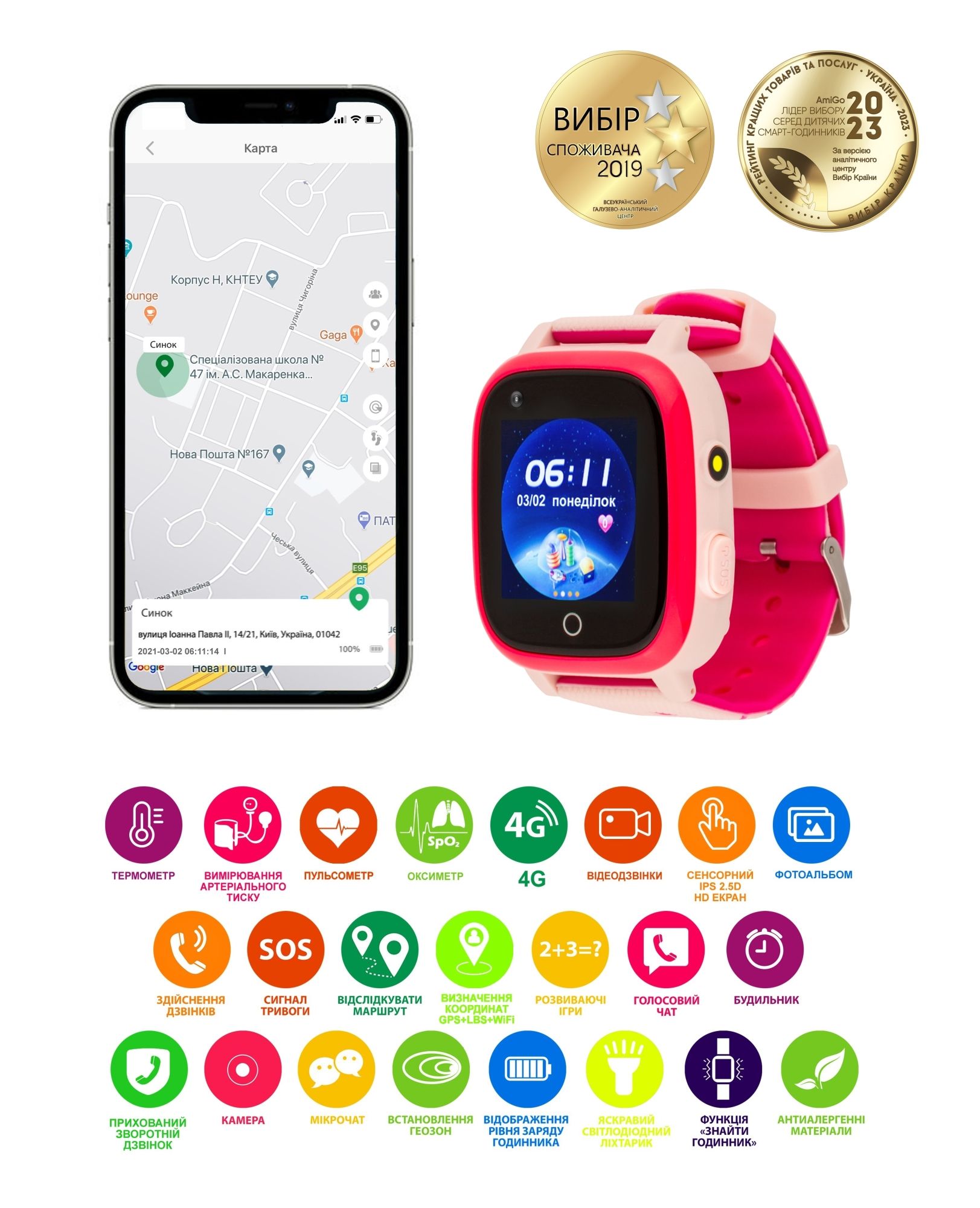 Смарт-часы для детей AmiGo GO005 Термометр 4G WIFI Розовый UA UCRF