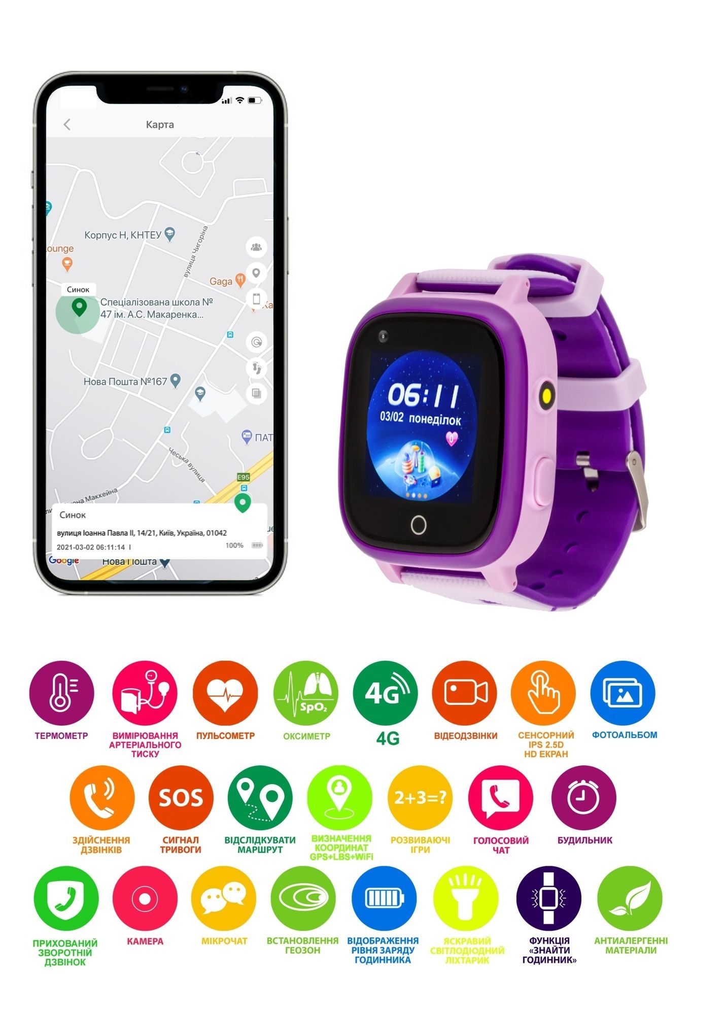 Детские смарт-часы с термометром AmiGo GO005 4G WIFI Purple UA UCRF