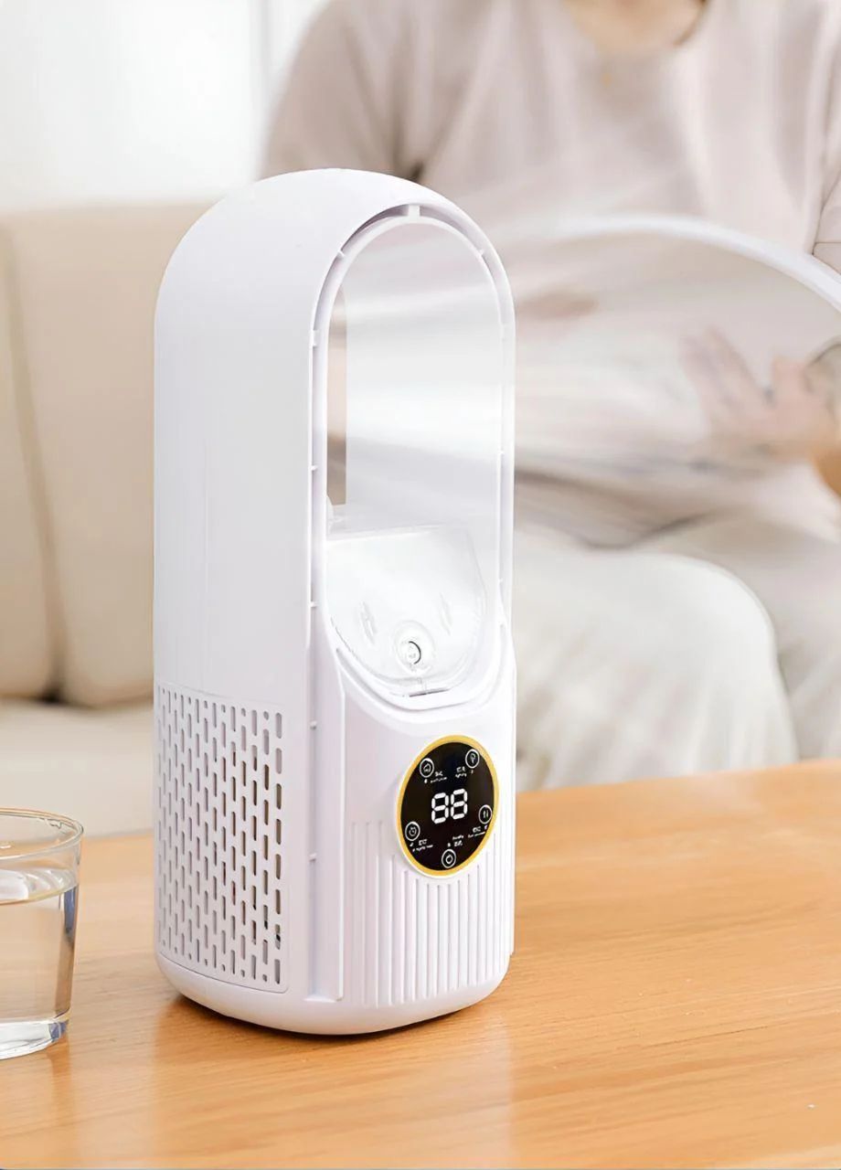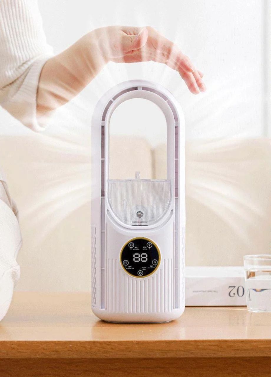 Компактный настольный вентилятор BYM-908S совмещает сразу три устройства в одном: вентилятор, мини-увлажнитель и атмосферный светильник. Безлопастная конструкция, тихая работа и питание от USB делают его удобным решением для дома, офиса, спальни или детской.