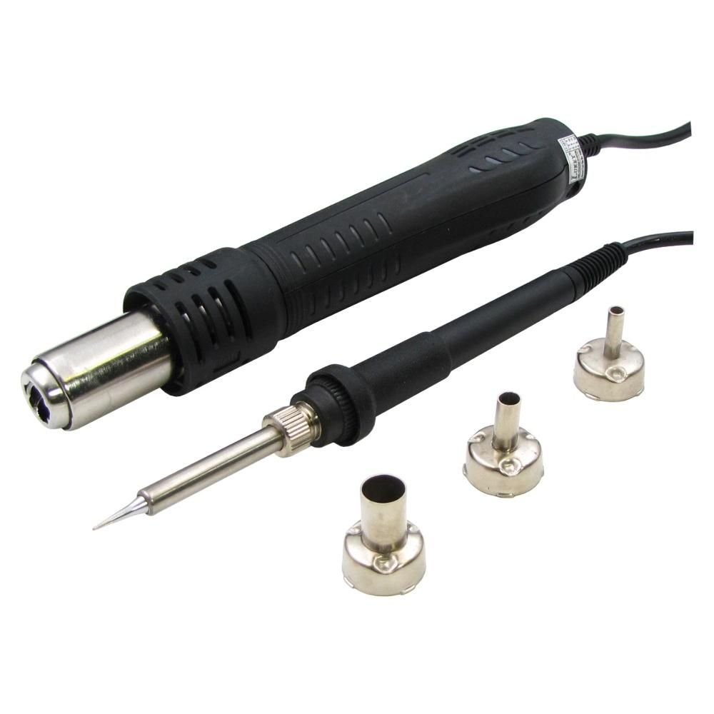 - Тип фена – турбинный. Плавная регулировка воздушного потока, сменные насадки и широкий температурный диапазон 100–480 °C позволяют безопасно демонтировать и запаивать микросхемы DIP, SOIC, QFP, PLCC, BGA и другие корпусные исполнения.