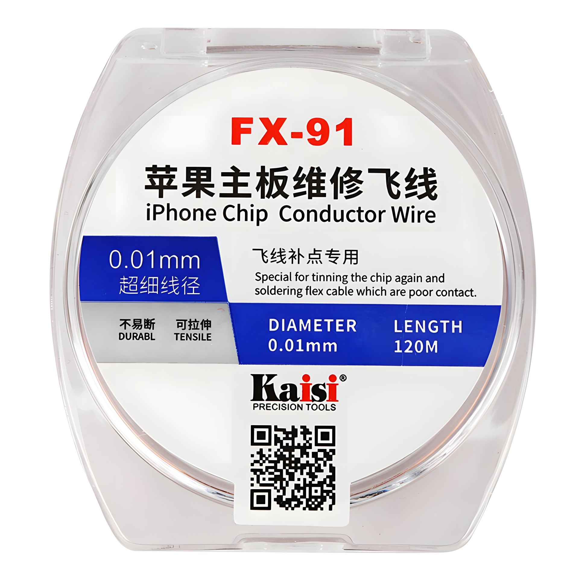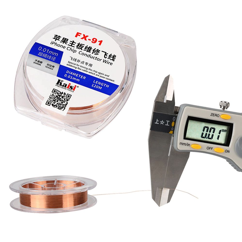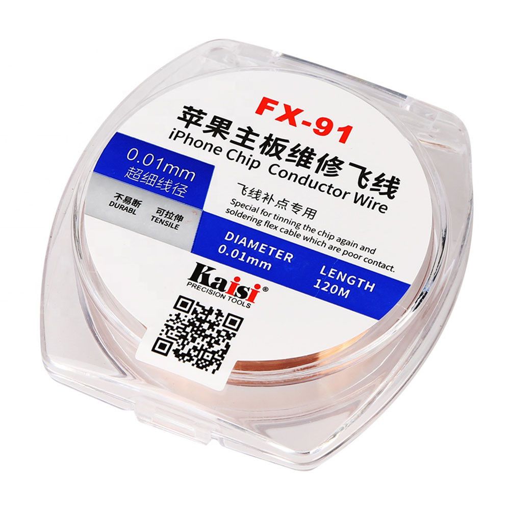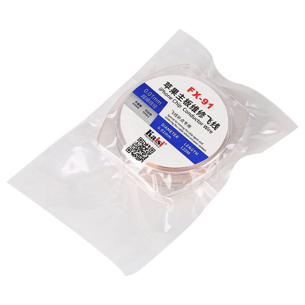 Тонкая проводящая проволока Kaisi FX-91 предназначена для высокоточных платных ремонтов — восстановления дорожек, монтажа «fly-line» перемычек, допайки выводов микросхем и шлейфов, в том числе на материнских платах iPhone и другой современной электроники. Медная эмалированная жила диаметром всего 0,01 мм сочетает высокую прочность на разрыв и эластичность, что позволяет работать даже с сильно загруженными областями платы без риска обрыва.