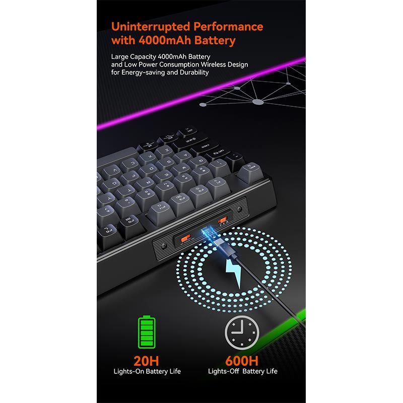 - Аккумулятор с ёмкостью 4000 мА·ч обеспечивает длительную автономную работу, позволяя использовать клавиатуру без частой подзарядки.