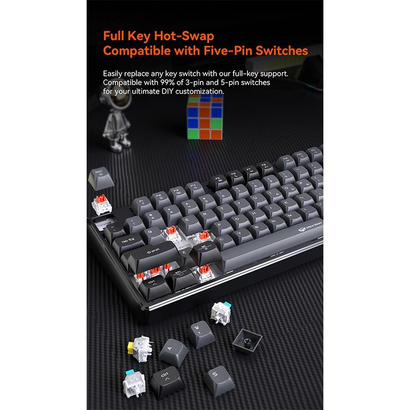 Meetion MT-MK14 — это компактная механическая клавиатура формата TKL (87 клавиш), сочетающая универсальность, высокое качество сборки и широкие возможности кастомизации. Модель поддерживает три режима подключения, оснащена горячей заменой переключателей (hot-swap), яркой RGB-подсветкой и ёмким аккумулятором, что делает её отличным выбором как для игр, так и для работы.