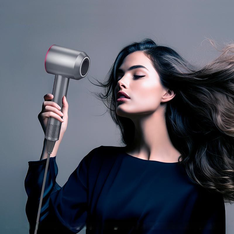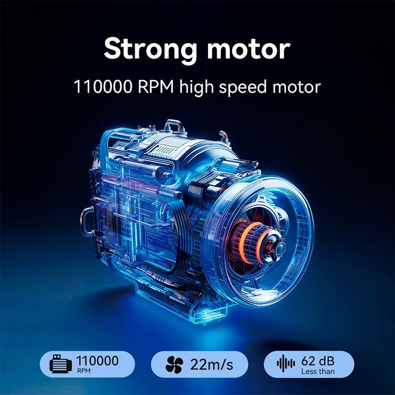 - Этот фен оснащён мощным двигателем с частотой вращения до 110 000 об/мин, который создаёт интенсивный поток воздуха со скоростью до 22 м/с. Это обеспечивает быструю и равномерную сушку волос любой длины и густоты при минимальном уровне шума.