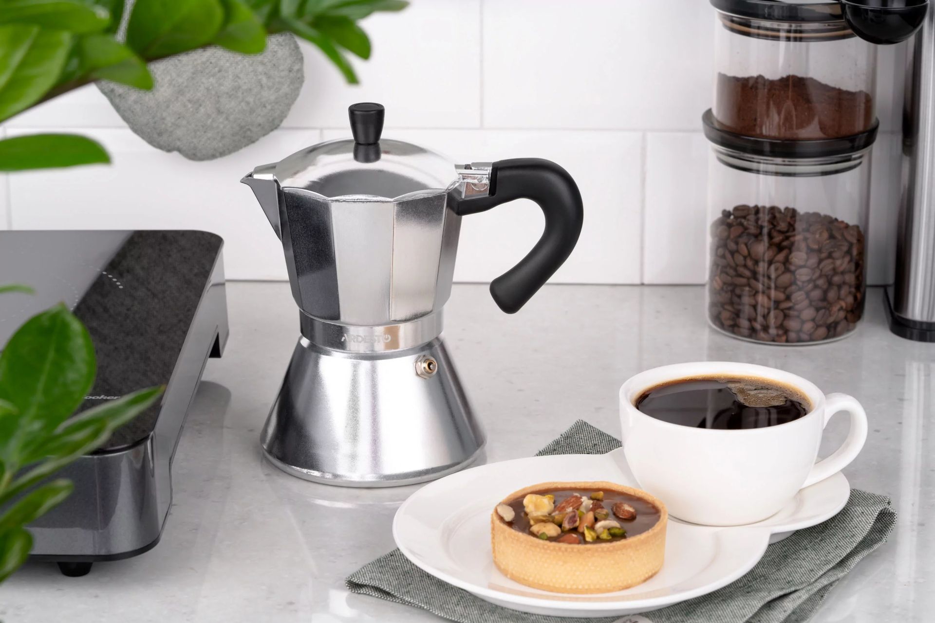 Эта модель выполнена из алюминия с безопасной нейлоновой ручкой, что исключает риск ожогов. Объем 450 мл позволяет приготовить до девяти чашек кофе одновременно. Эта кофеварка совместима с газовыми, электрическими, индукционными, стеклокерамическими и галогенными плитами. Не рекомендуется мытье в посудомоечной машине.