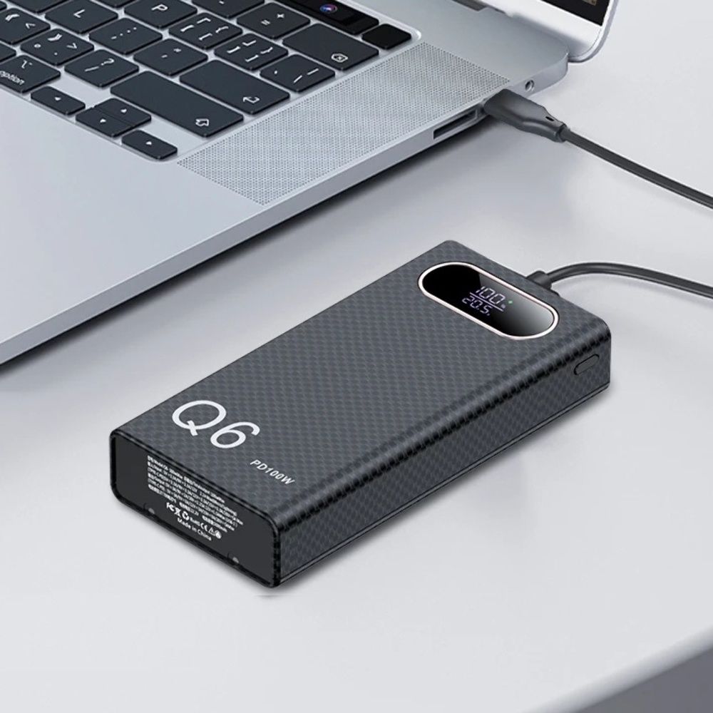 Повербанк Q6 — это мощный внешний аккумулятор высокой ёмкости, предназначенный для зарядки ноутбуков, планшетов, смартфонов и другой портативной электроники. Устройство поддерживает современные протоколы быстрой зарядки с максимальной мощностью до 100 Вт и позволяет одновременно питать до четырёх устройств. Оснащён цифровым LCD-дисплеем для точного контроля параметров работы и выполнен в прочном корпусе с лаконичным дизайном.