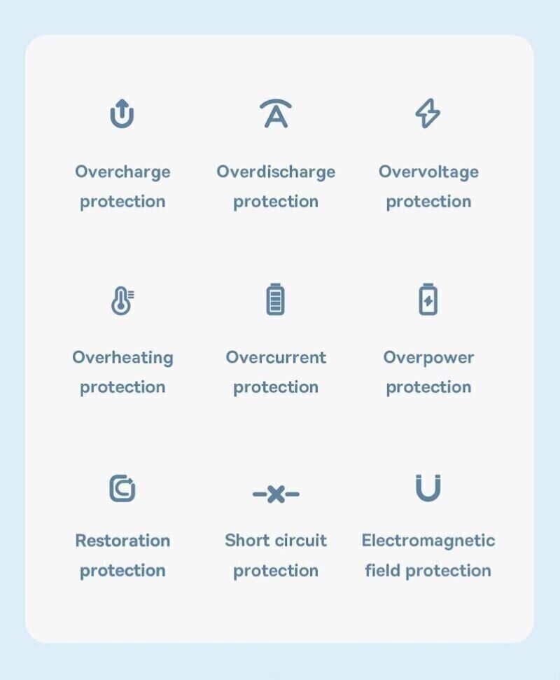 - Встроенные 9 уровней защиты оберегают устройства от перегрева, перегрузки по току, перенапряжения, короткого замыкания и перезаряда, продлевая срок службы аккумулятора и подключенных гаджетов.