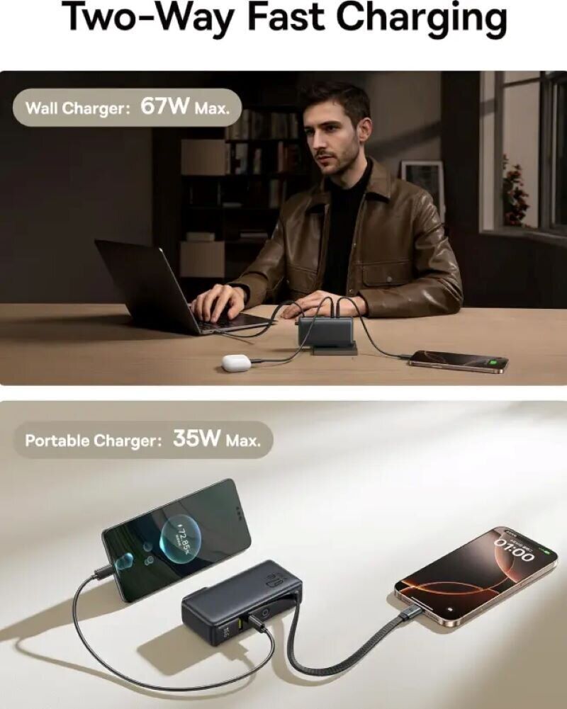 - Мощность до 67 Вт при работе от сети и до 35 Вт в портативном режиме обеспечивает быструю зарядку как смартфонов, так и более энергоёмких устройств, существенно экономя время.