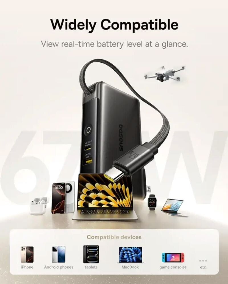 Устройство может работать как от встроенного аккумулятора, так и напрямую от сети 220V, обеспечивая быструю и стабильную подачу энергии для смартфонов, планшетов, наушников и другой электроники. Благодаря высокой мощности до 67 Вт и продуманной конструкции Baseus Nomos NT11 способен заменить сразу несколько зарядных устройств.