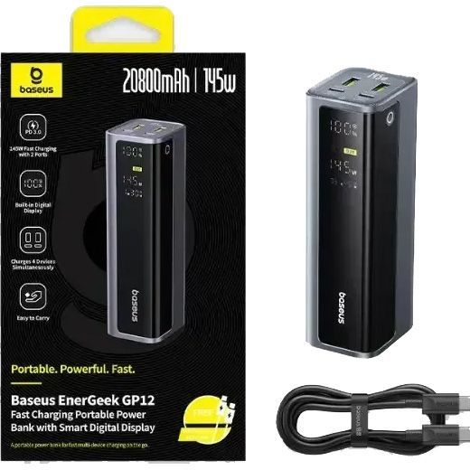 Baseus EnerGeek GP12 — это высокомощный универсальный внешний аккумулятор, созданный для зарядки не только смартфонов и планшетов, но и ноутбуков, портативных консолей и другой энергоёмкой техники. Благодаря ёмкости 20 800 мА·ч и максимальной выходной мощности до 145 Вт, модель отлично подходит для путешествий, работы в дороге и повседневного использования. Это устройство поддерживает современные стандарты быстрой зарядки, оснащено интеллектуальным цифровым дисплеем и соответствует требованиям авиаперевозок, что делает его надёжным источником энергии в любых условиях.