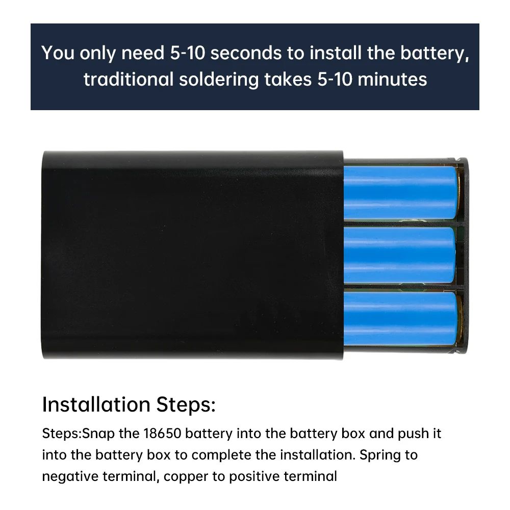 - Аккумуляторы 18650 устанавливаются за 5–10 секунд без пайки — достаточно вставить элементы в отсек с пружинными контактами.