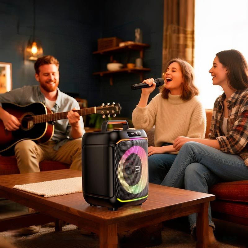HOCO DS72 — это универсальнаяпортативнаяакустикаформата«караоке», оснащённая 8-дюймовым динамиком, беспроводныммикрофоном и яркой RGB-подсветкой. Мощность 20 Втобеспечиваетгромкий и насыщенныйзвук, а компактныеразмеры и прочныйкорпусделаютколонкуудобнойдляиспользованиядома, натренировках, вечеринках и отдыхенаприроде.