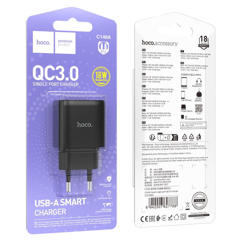 Сетевое Зарядное Устройство Hoco C140A 1USB QC 18W Черный