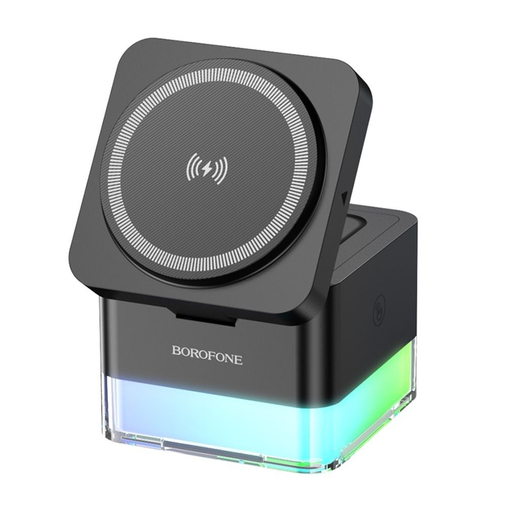 Модель выполнена в компактной кубической форме с плавно закруглёнными гранями и прозрачным основанием с динамической RGB-подсветкой. Такое решение делает зарядку визуально привлекательной и подчёркивает современный характер устройства. Borofone BQ34 идеально подходит для рабочего стола, прикроватной тумбы или гостиной зоны.