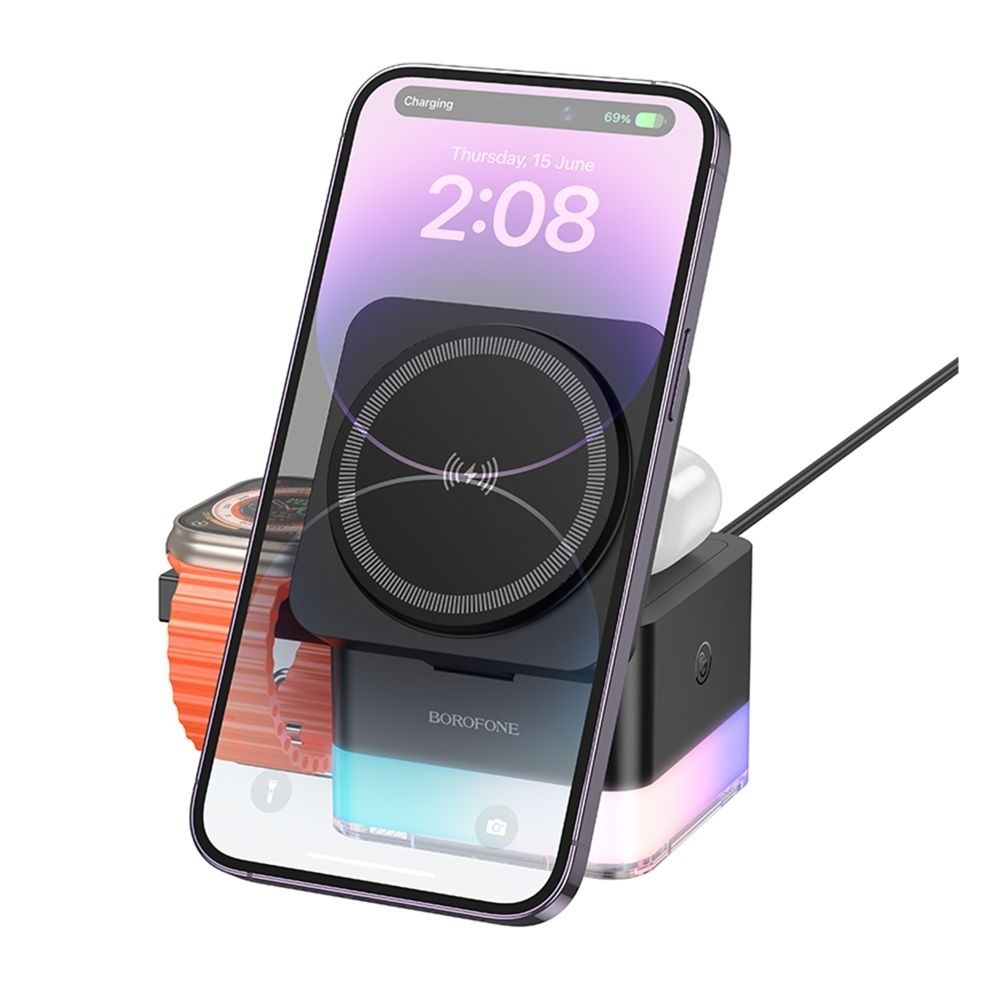 Беспроводное Зарядное Устройство Borofone BQ34 3 in1 Magnetic 15W For iWatch Черный
