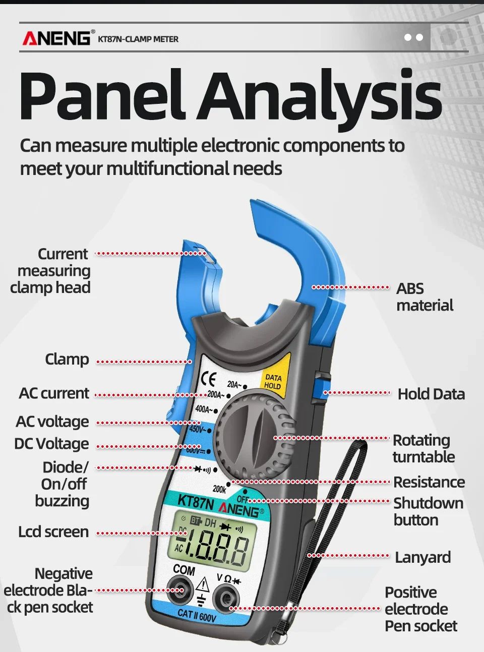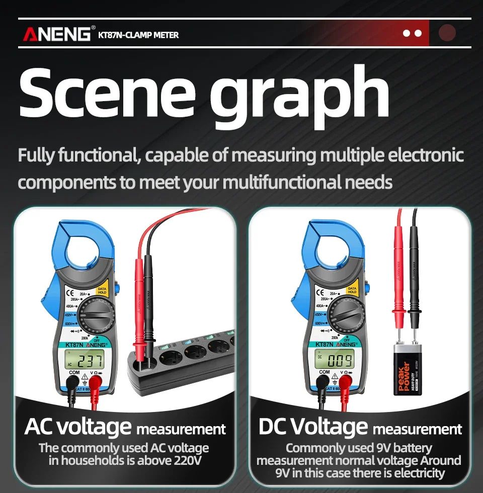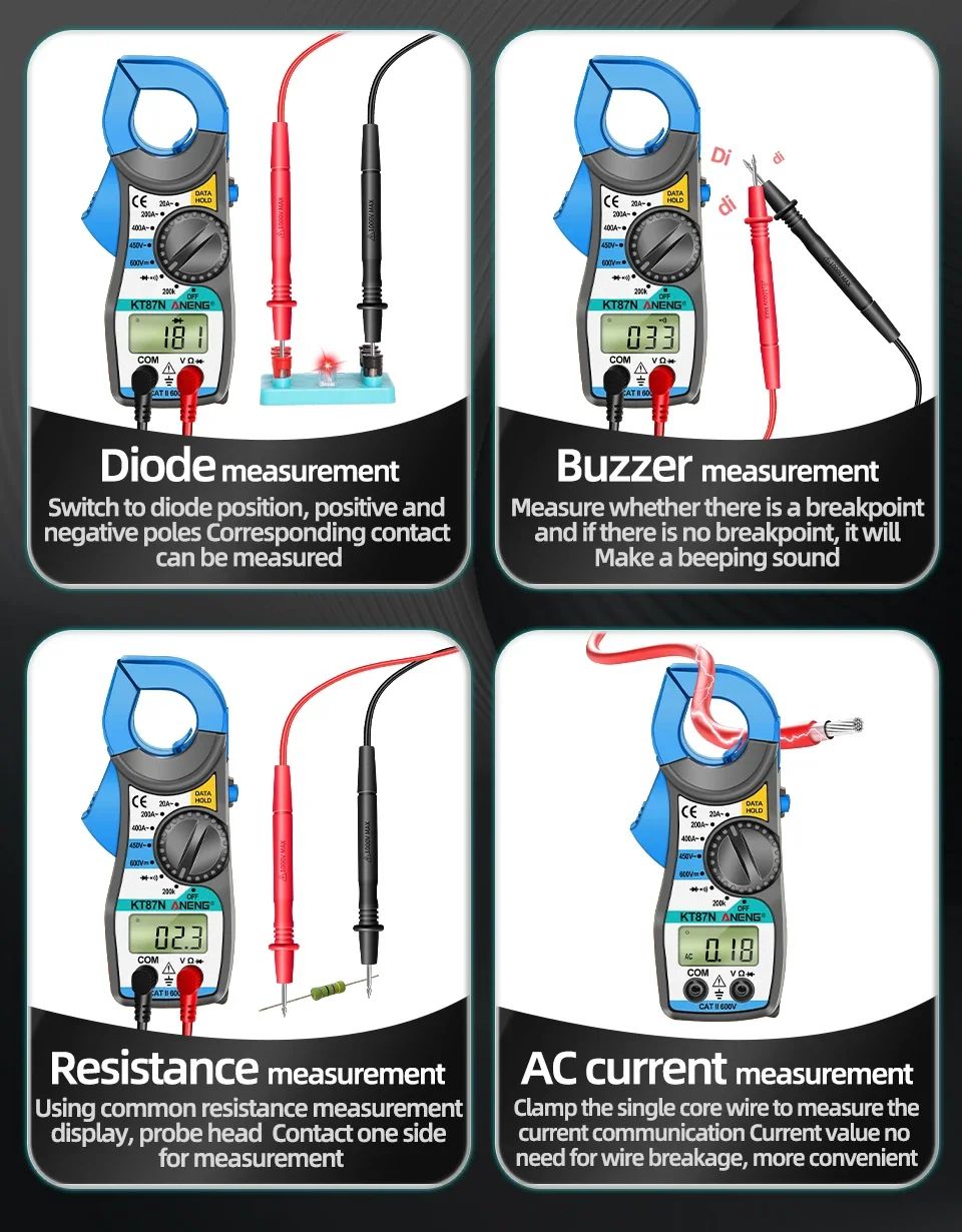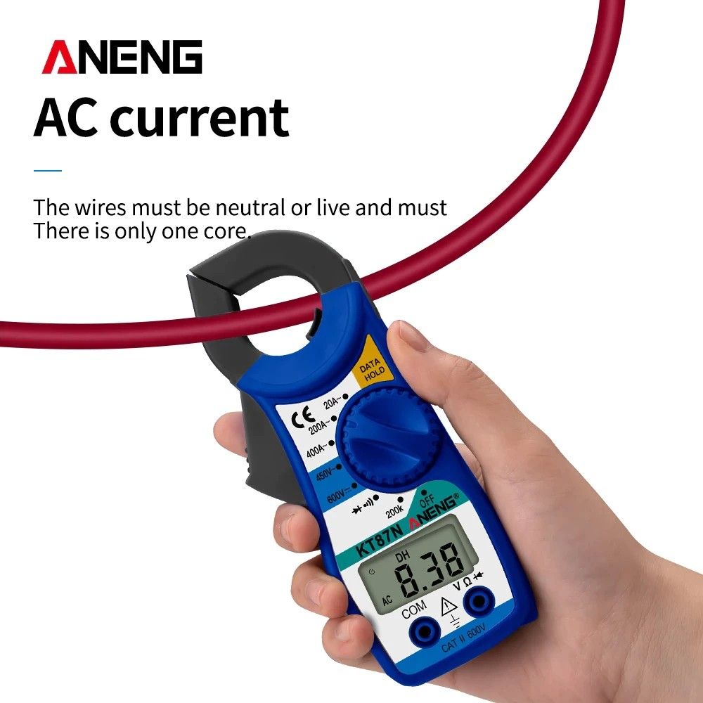 ANENG KT87N — это компактные цифровые токовые клещи с функцией мультиметра, предназначенные для безопасного измерения переменного тока без разрыва цепи. Прибор объединяет возможности классического мультиметра и токоизмерительных клещей, что делает его универсальным инструментом для электромонтажных, сервисных и бытовых работ.