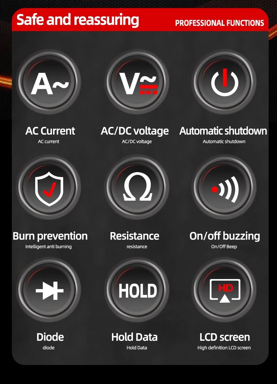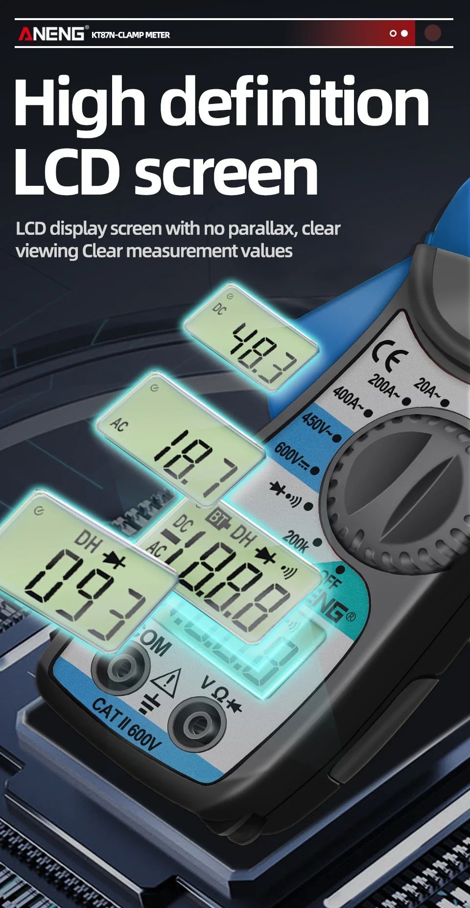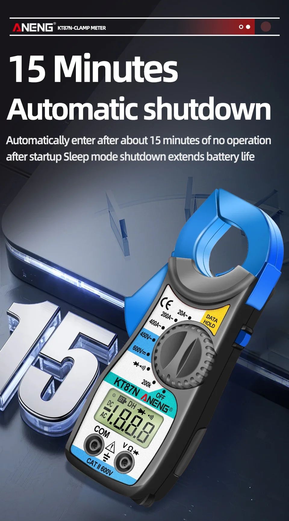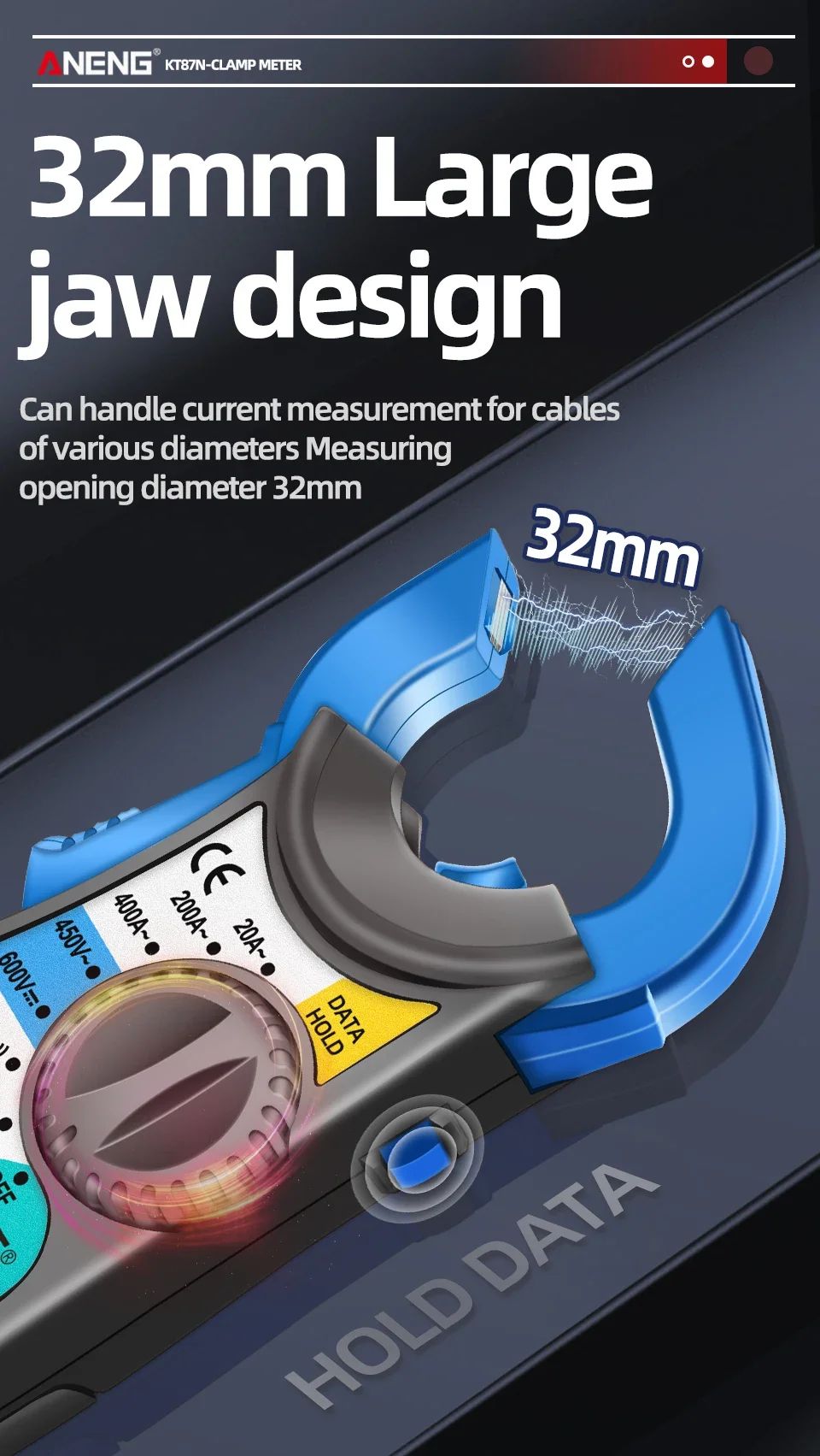 ANENG KT87N — это компактные цифровые токовые клещи с функцией мультиметра, предназначенные для безопасного измерения переменного тока без разрыва цепи. Прибор объединяет возможности классического мультиметра и токоизмерительных клещей, что делает его универсальным инструментом для электромонтажных, сервисных и бытовых работ.