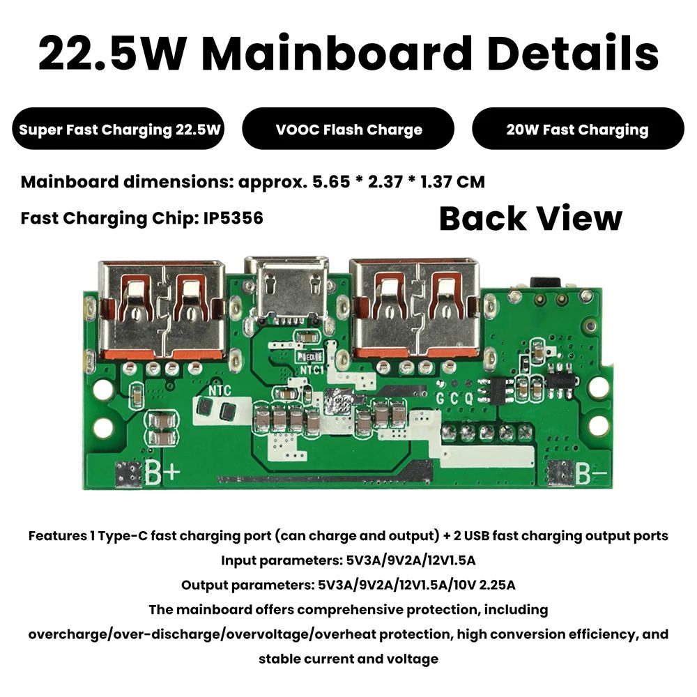 - Интеллектуальный чип IP5356 поддерживает основные публичные протоколы быстрой зарядки, совместимые с большинством современных смартфонов.