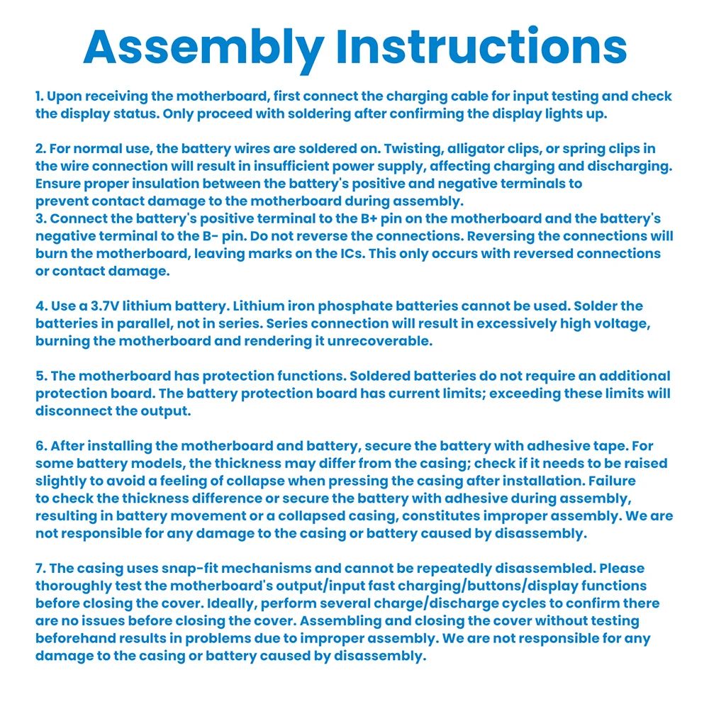 - Перед окончательной сборкой необходимо проверить работу входов, выходов, дисплея и быстрой зарядки.