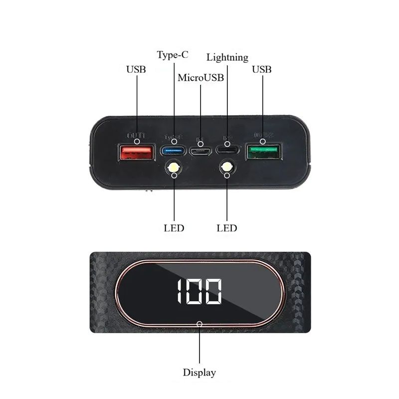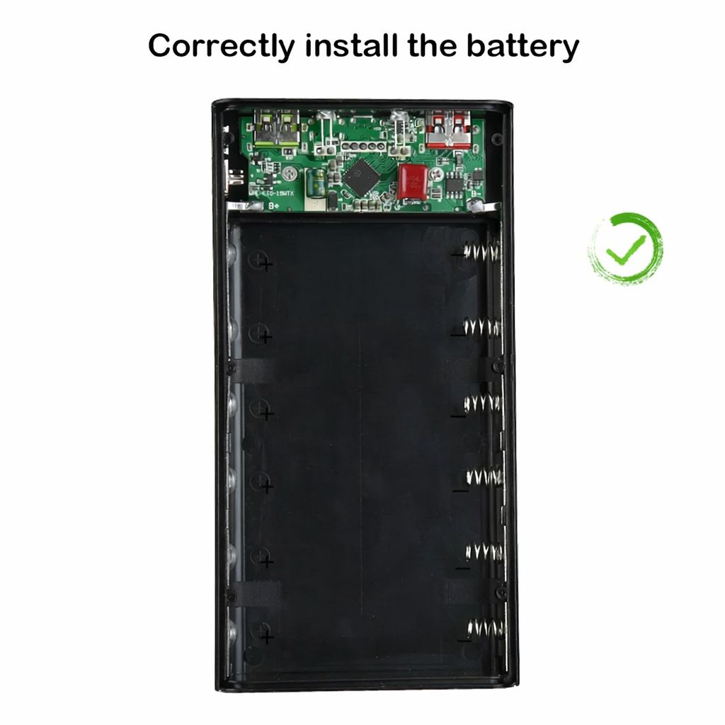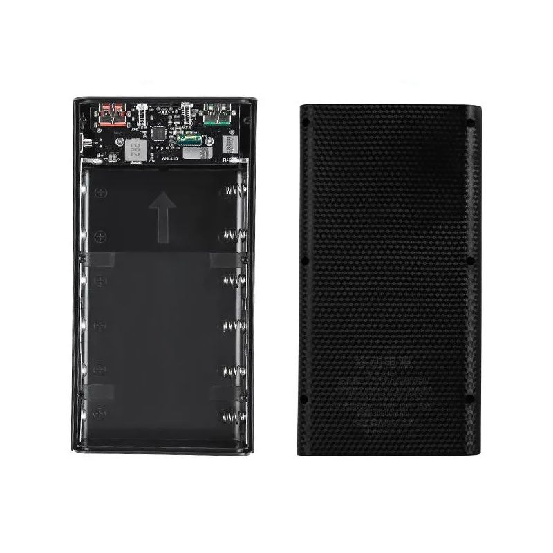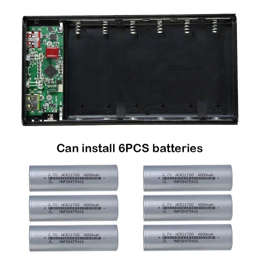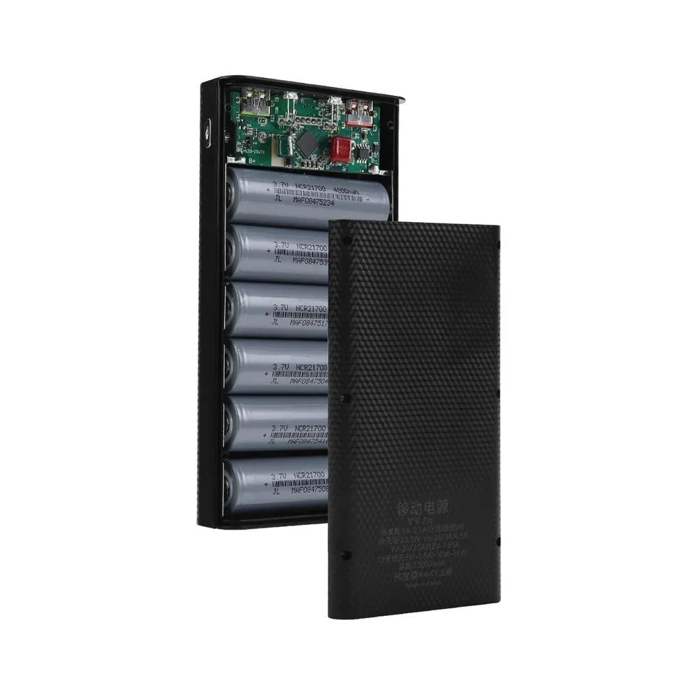 Корпус рассчитан на установку до 6 литиевых аккумуляторов 21700 с плоскими контактами (в комплект не входят) и подходит для многократной разборки и замены элементов. Это практичное решение для пользователей, которые хотят самостоятельно собрать повербанк с нужной ёмкостью и характеристиками.