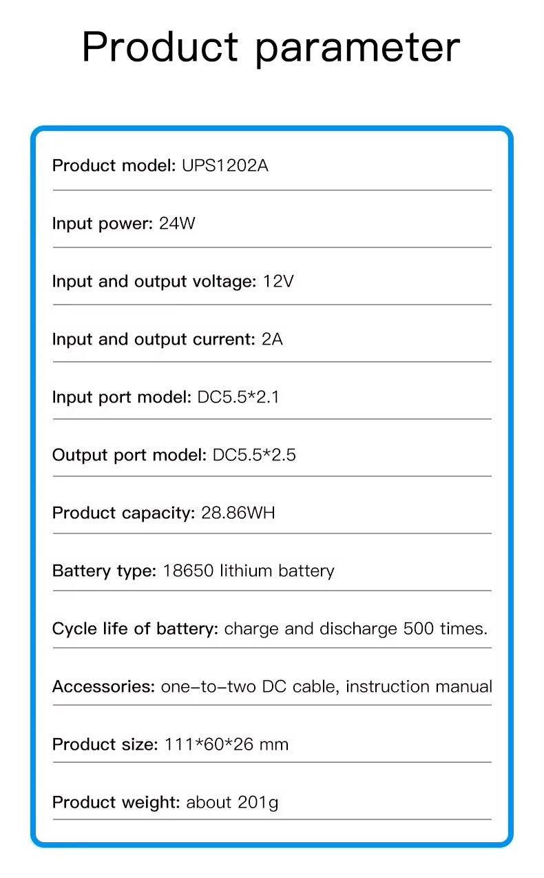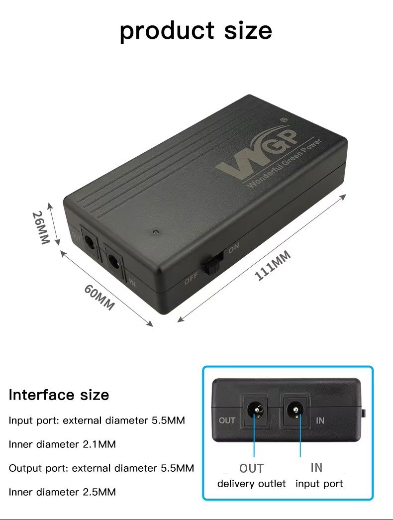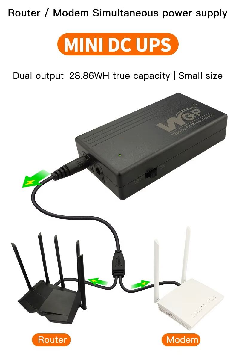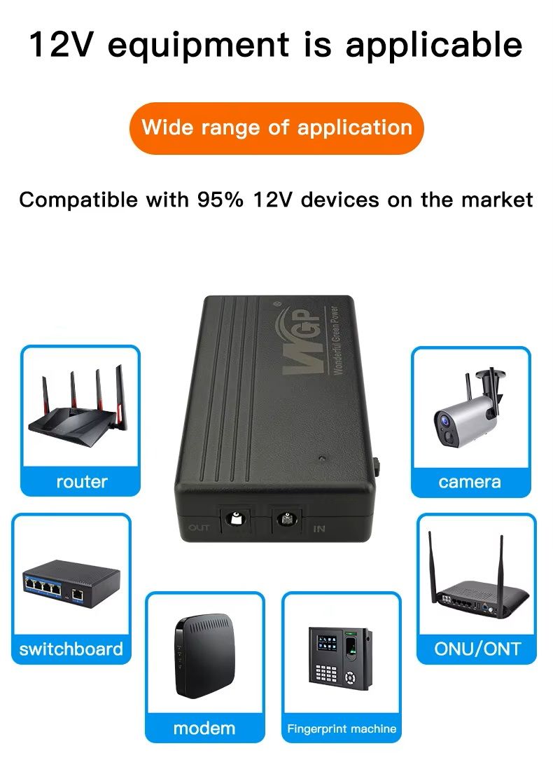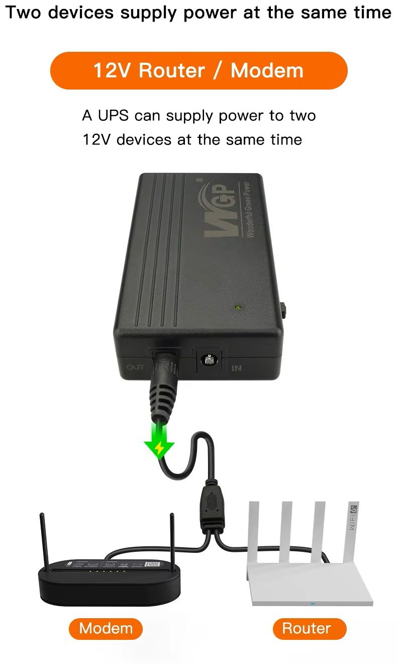 - Мини UPS обеспечивает бесперебойное питание 12 V устройств при отключении электроэнергии, что особенно важно для маршрутизаторов, модемов, камер наблюдения, ONU/ONT и прочего оборудования. Он автоматически переключается на питание от аккумулятора без задержек, сохраняя работу сети и подключения.