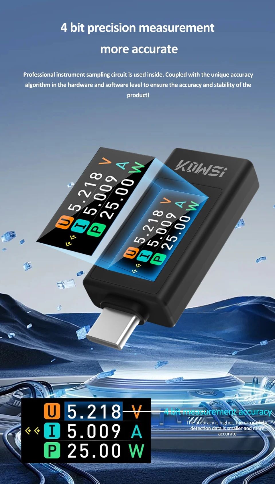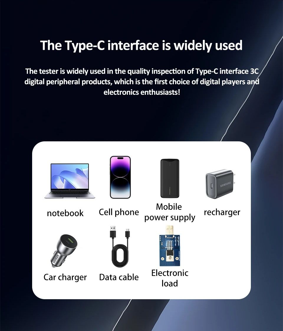 - Этот прибор совместим с современными системами быстрой зарядки и подходит для тестирования устройств с интерфейсом Type-C.