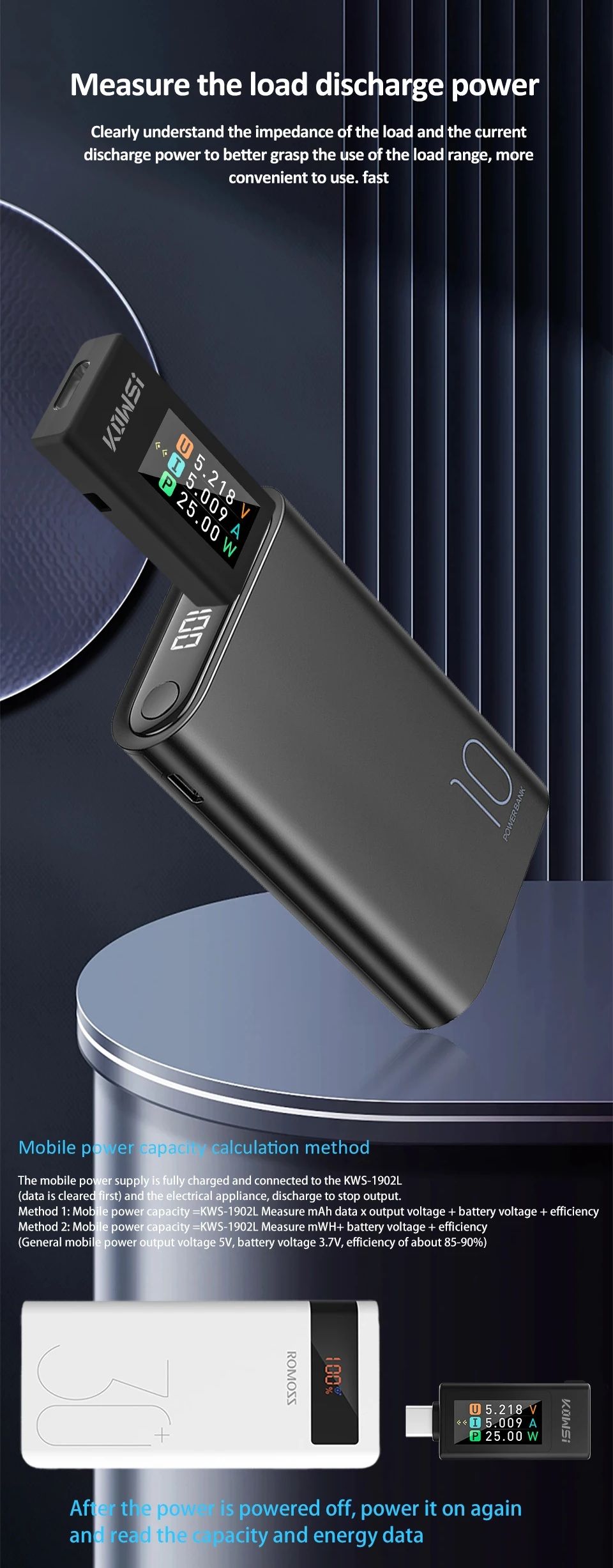 Тестер KOWSI KWS-1902L — это компактный профессиональный измерительный прибор, предназначенный для контроля параметров питания через интерфейс Type-C. Устройство позволяет в реальном времени отслеживать напряжение, силу тока, мощность, ёмкость аккумулятора и потребляемую энергию. Такой тестер широко используется для диагностики зарядных устройств, кабелей, внешних аккумуляторов (повербанков), смартфонов, ноутбуков и других цифровых устройств.