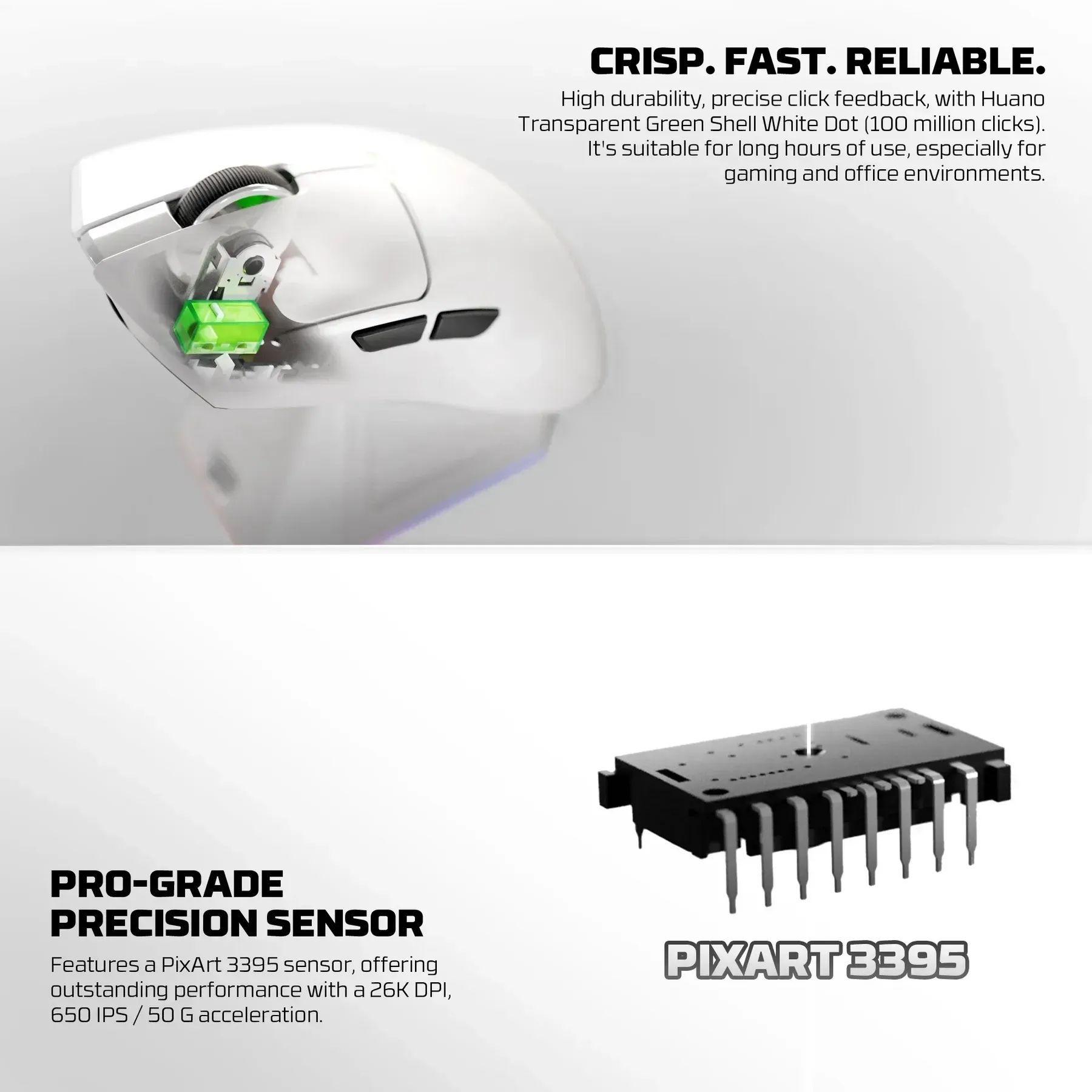 - Основные кнопки оснащены переключателями Huano Transparent Green Shell White Dot, рассчитанными примерно на 100 миллионов нажатий. Они обеспечивают четкий и быстрый отклик при каждом клике.