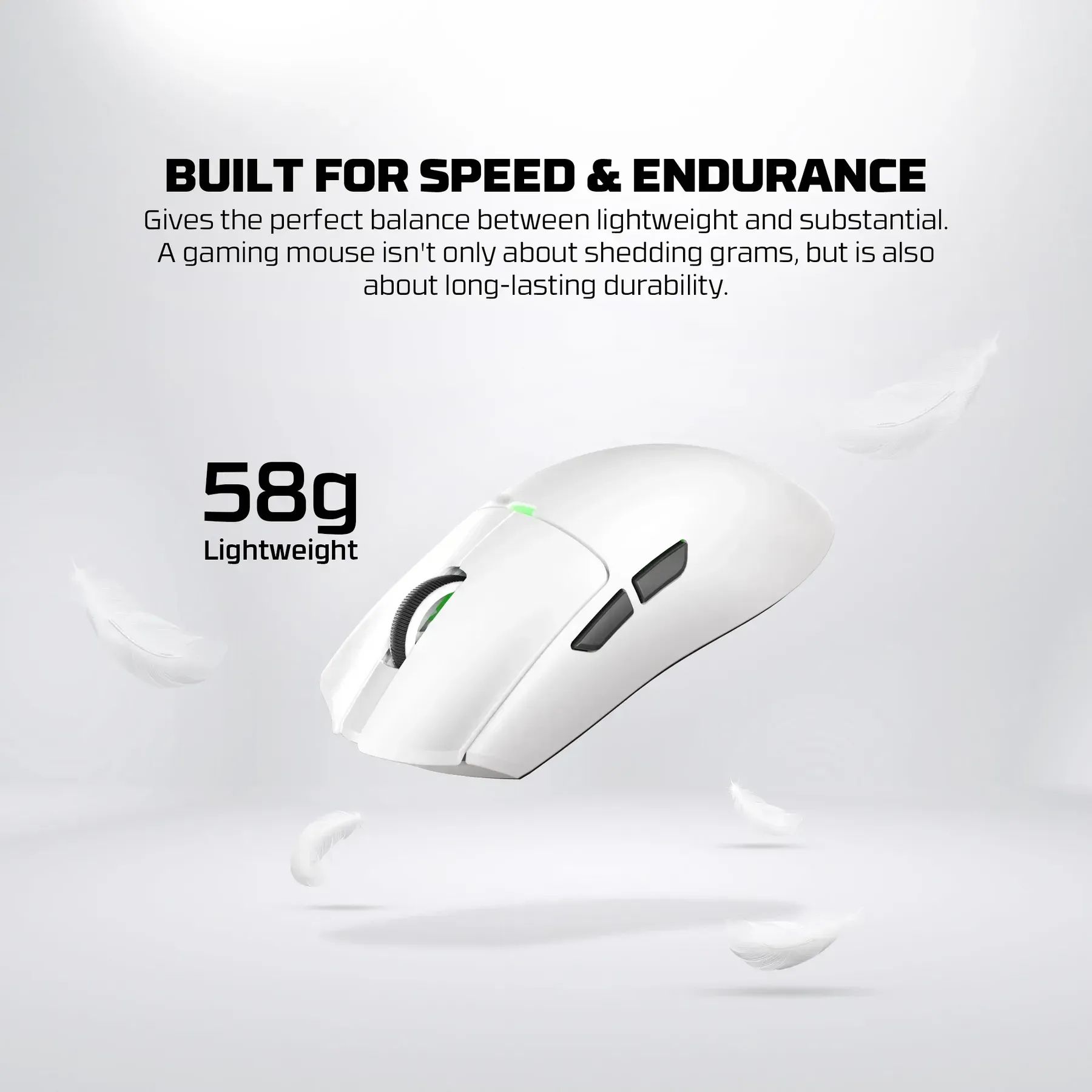 - Вес всего 58 г значительно снижает нагрузку на руку и позволяет выполнять быстрые движения с высокой точностью даже во время длительных игровых сессий.