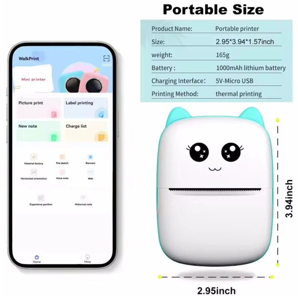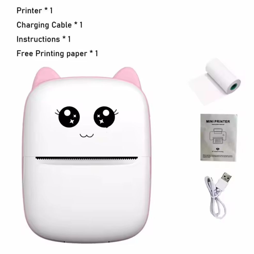 Мини-термопринтер Mini CAT BT — это компактное и удобное устройство для беспроводной печати фото, заметок, стикеров и различных шаблонов прямо со смартфона. Благодаря поддержке Bluetooth и специальному приложению, этот принтер легко подключается к устройствам на базе Android и iOS, обеспечивая быстрый и простой процесс печати без проводов.