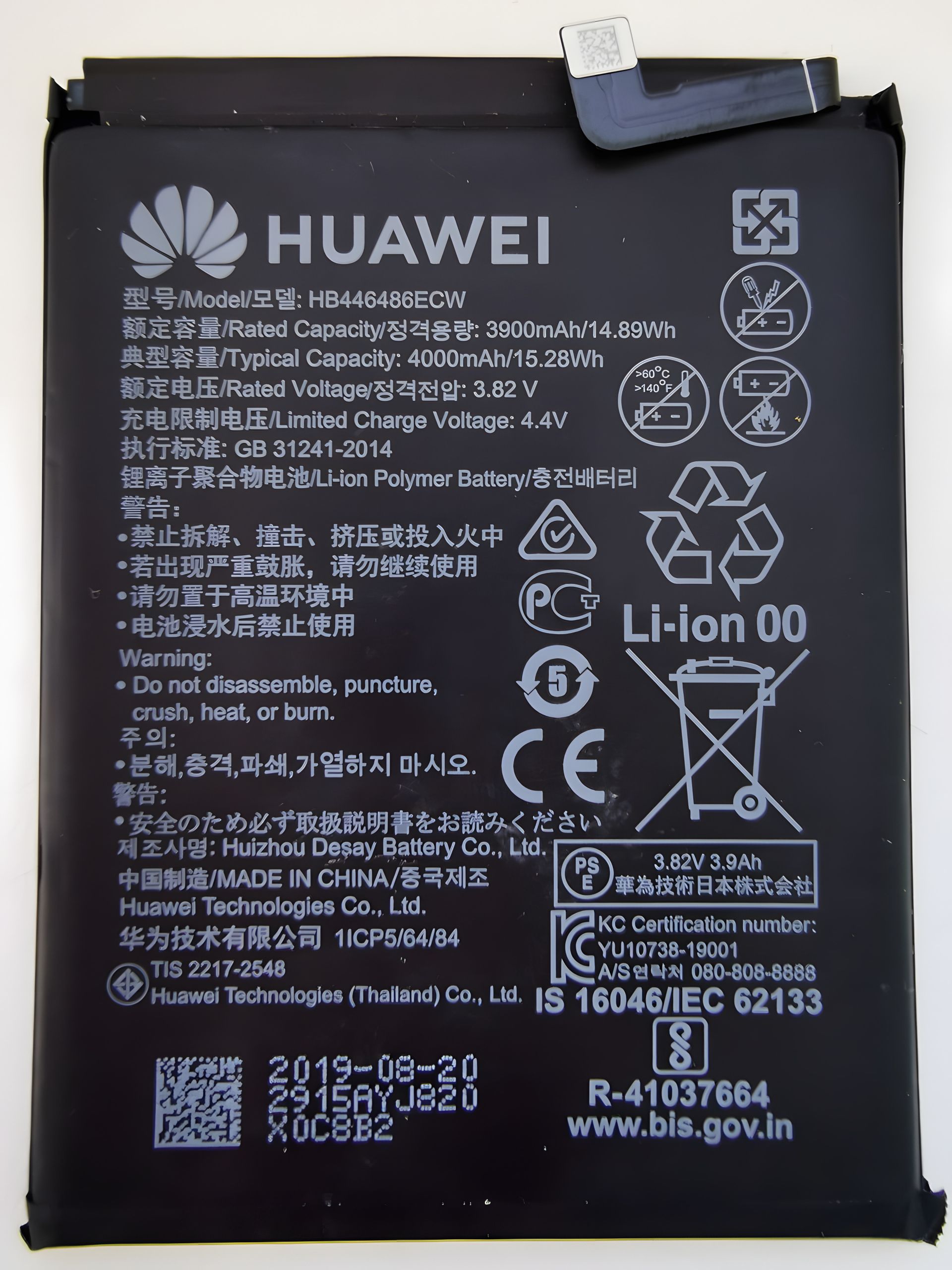 Аккумулятор для Huawei HB446486ECW (P smart Z, STK-L21A, P20 Lite 2019, GLK-LX1U) 3900 mAh [Original PRC] 12 мес. гарантии