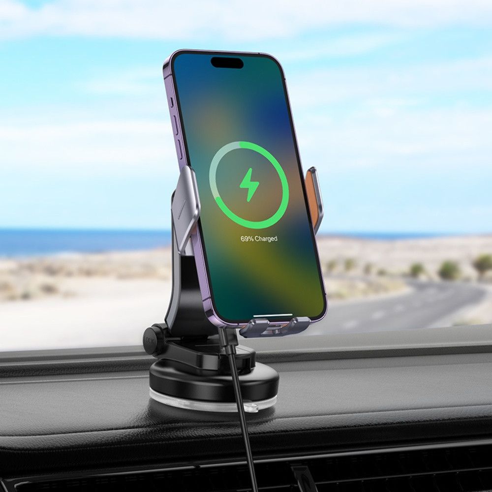 Этот держатель выполнен из прочного ABS-пластика с силиконовыми накладками и элементами из закалённого стекла. Вакуумная присоска гарантирует надежное крепление на торпеде или лобовом стекле, а телескопическая ножка и шарнирное соединение позволяют точно настроить положение смартфона под нужным углом обзора.